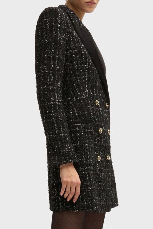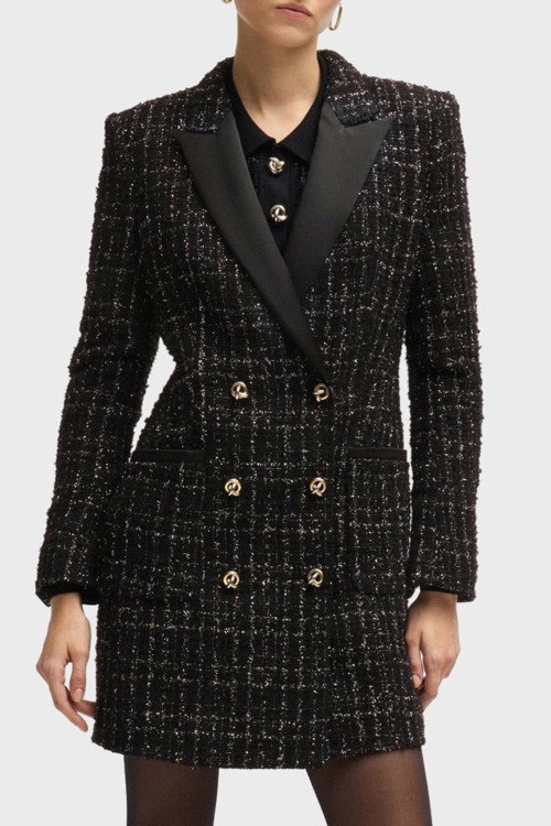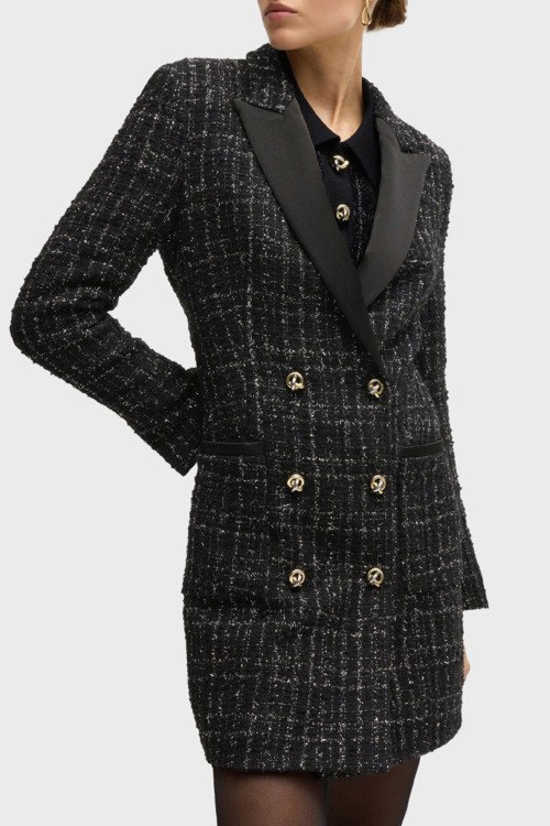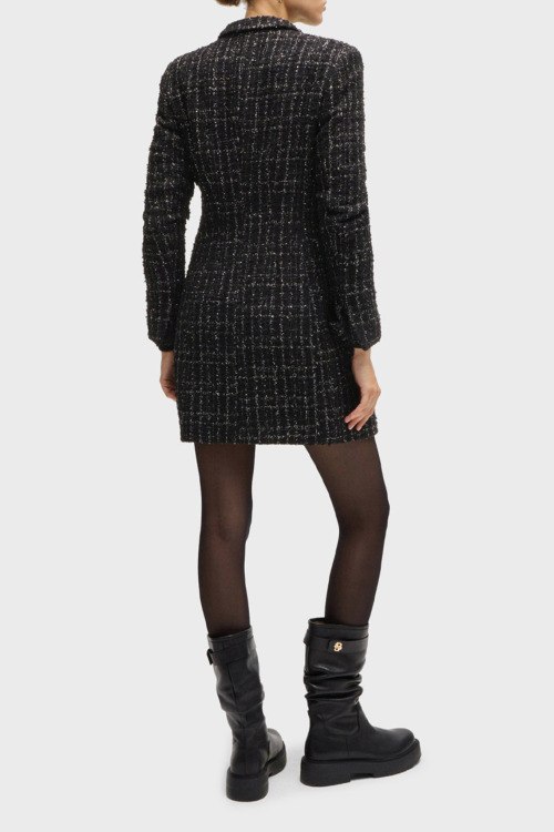 Детали: Женское черное твидовое платье-жакет Dansian от Hugo Boss (Хуго Босс). Двубортный фасон, отложной воротник, передние карманы, застежка на золотистые пуговицы, длинный рукав, короткая длина