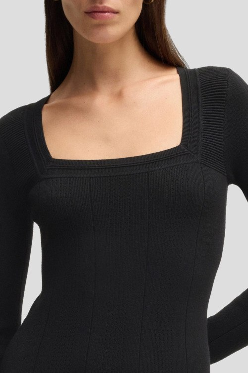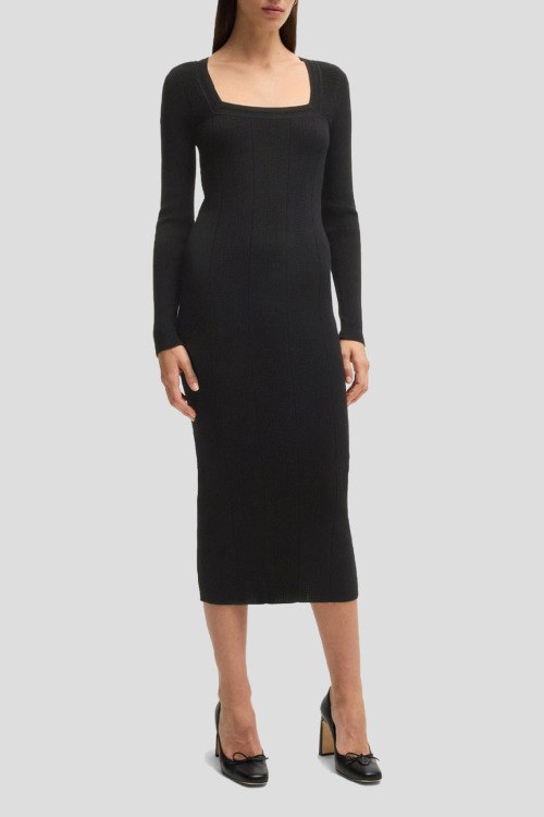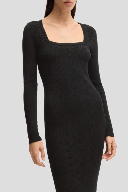Детали: Женское черное трикотажное платье от Hugo Boss (Хуго Босс). Дизайн в рубчик, квадратный вырез декольте, длинный рукав, облегающий фасон, длина-миди