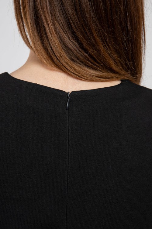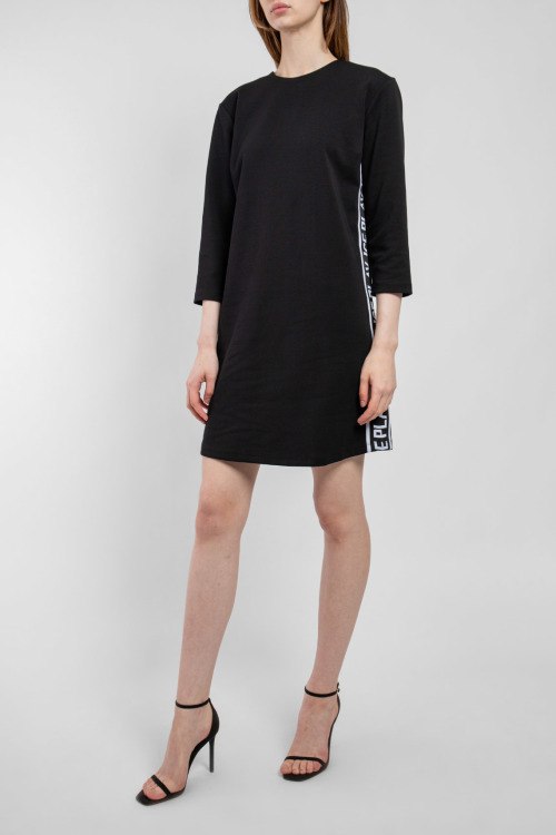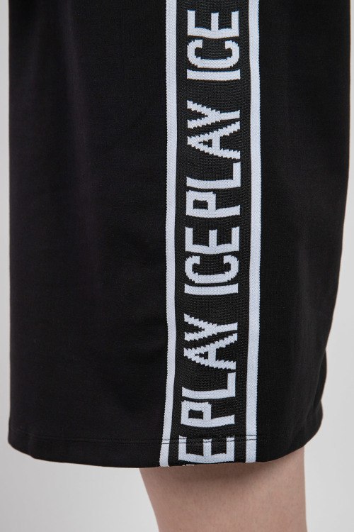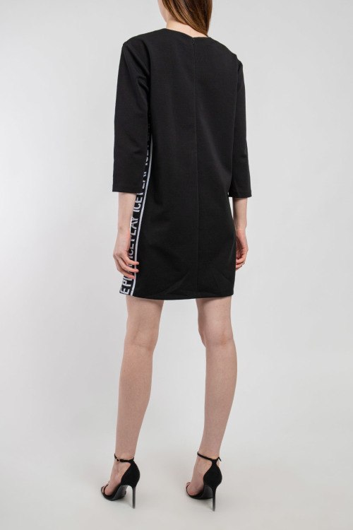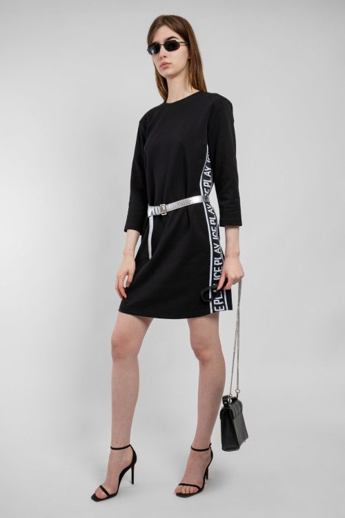 Женское черное платье из микса хлопка и полиэстера от Ice Play (Айс Плей). Короткая длина, круглый вырез горловины, застежка-молния на спине, длинные рукава, ровный подол, брендированные лампасы.