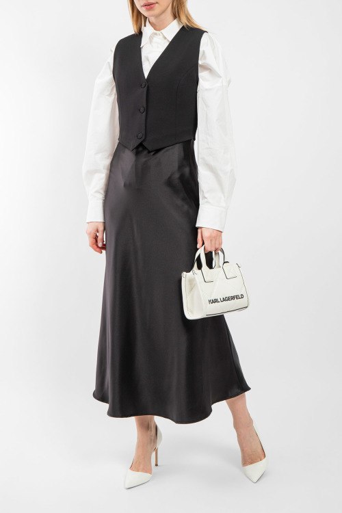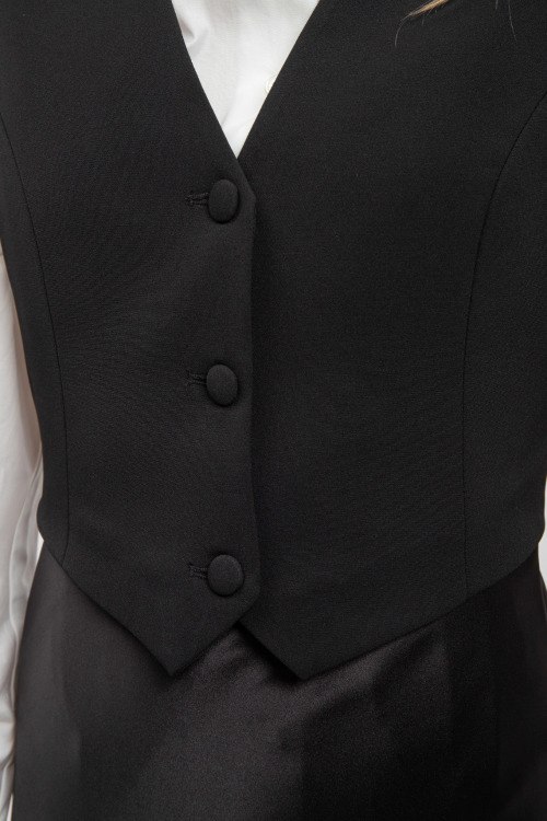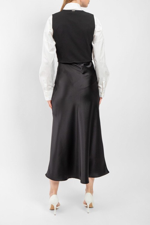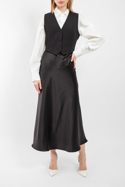 Женское черное платье из полиэстера от Liu Jo (Лиу Джо). Длина миди, комбинированный дизайн, жилет на пуговицах, V-образный вырез горловины, без рукавов, атласная юбка длиной миди.