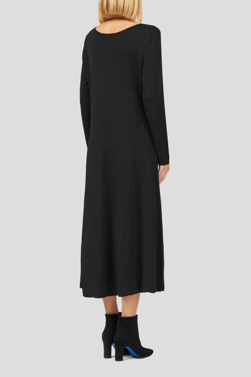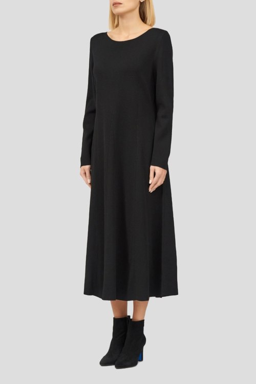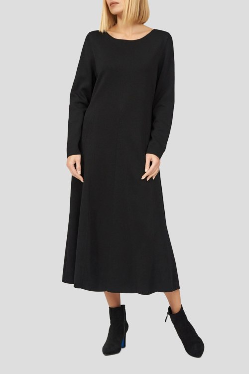 Детали: Женское черное платье из вискозы и полиамида от Marina Rinaldi (Марина Ринальди). Длина миди, круглый вырез горловины, длинные рукава, приталенный силуэт, расклешенная юбка, ровный подол