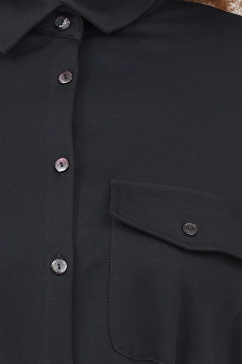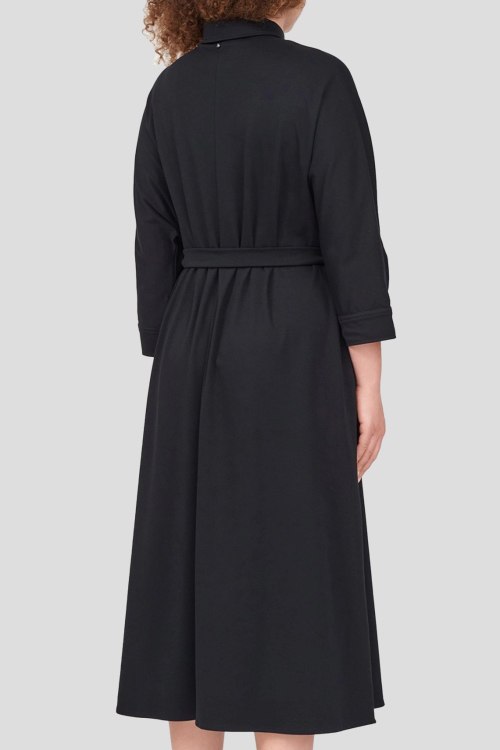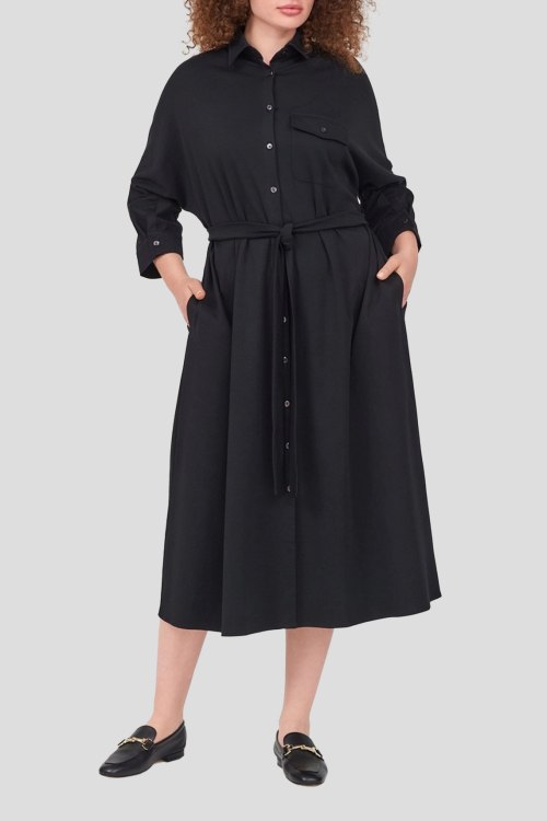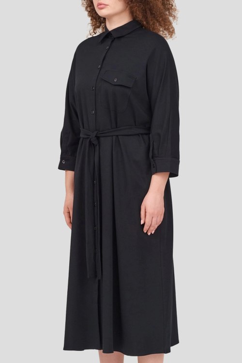 Детали: Женское черное платье из хлопка от Marina Rinaldi (Марина Ринальди). Длина миди, классический воротник, застежка на пуговицы, длинные рукава, нагрудные карманы, прорезные боковые карманы
