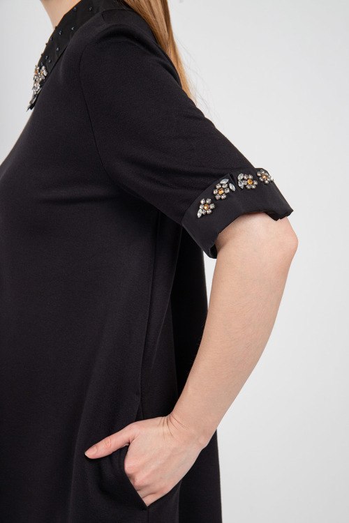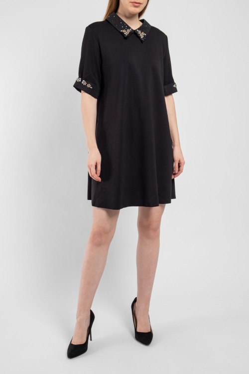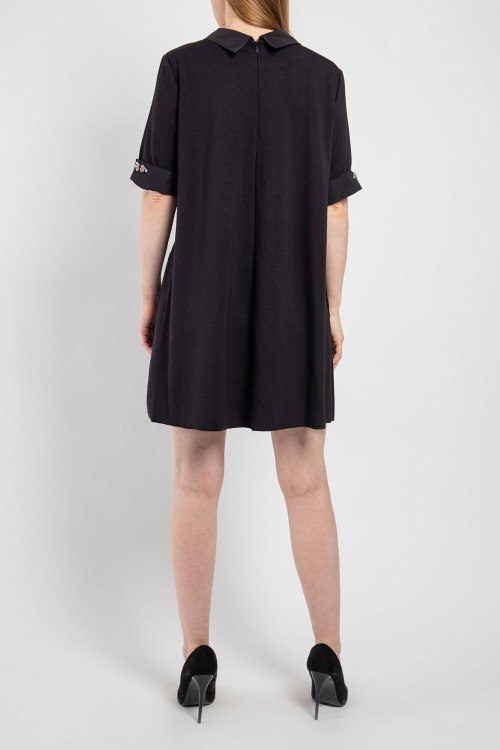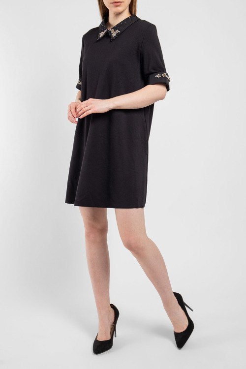Женское черное платье из вискозного микса от MAX&Co (Макс и Ко). Короткая длина, расклешенный силуэт, отложной воротник с пайэтками, на спине застежка-молния, прорезные боковые карманы, короткие рукава с аппликацией на манжете.