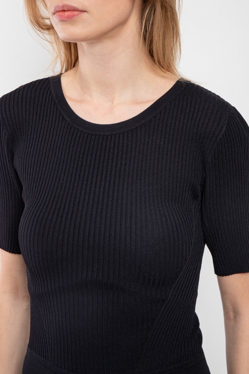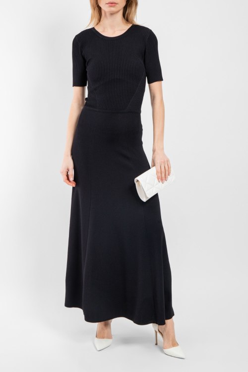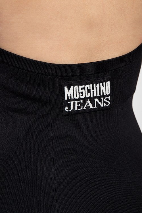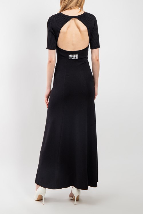 Женское черное платье из вискозы и полиамида от Moschino (Москино). Длина макси, круглый вырез горловины, открытая спина, короткие рукава, приталенный силуэт, логотип бренда, расклешенная юбка, ровный подол.