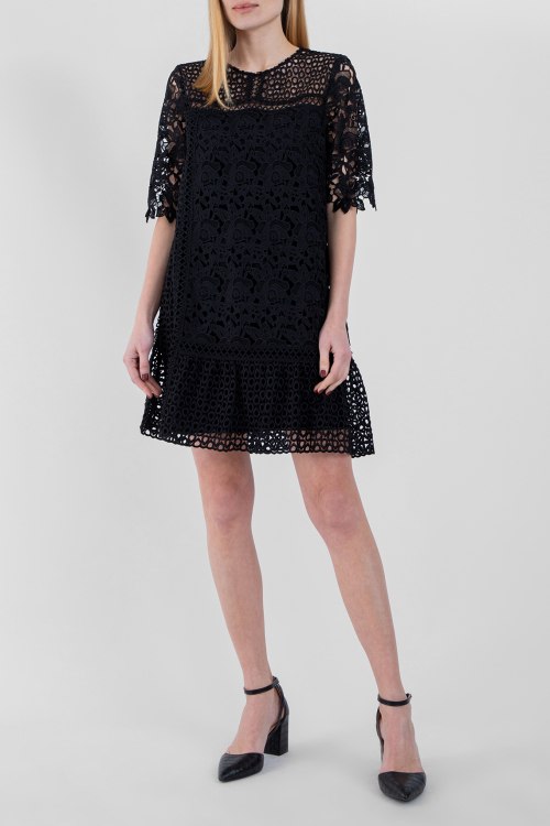 Женское черное платье от Pinko (Пинко). Короткая длина, круглый вырез горловины, застежка на пуговицы на спине, кружевной дизайн, короткие рукава, ровный подол.