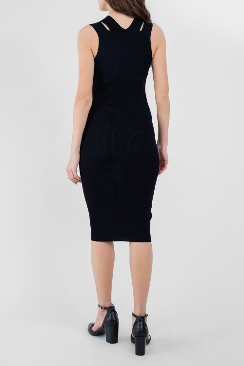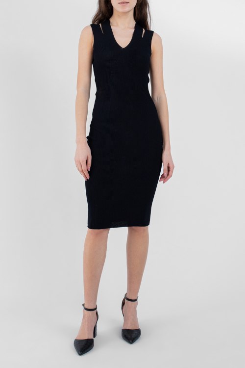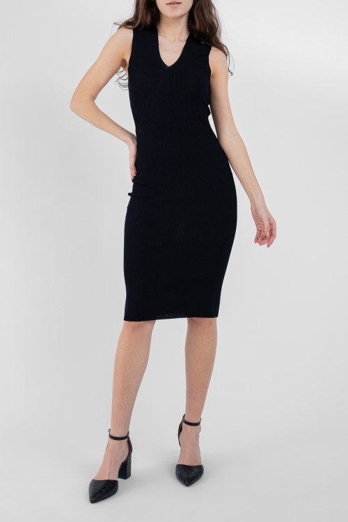 Женское черное платье из вискозного микса от Pinko (Пинко). Дизайн в рубчик, облегающий фасон, модель без рукавов, V-образный вырез декольте, длина-миди.