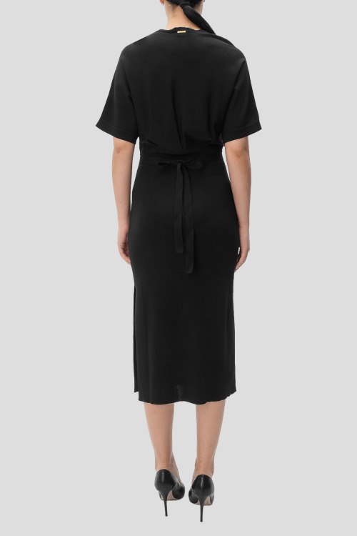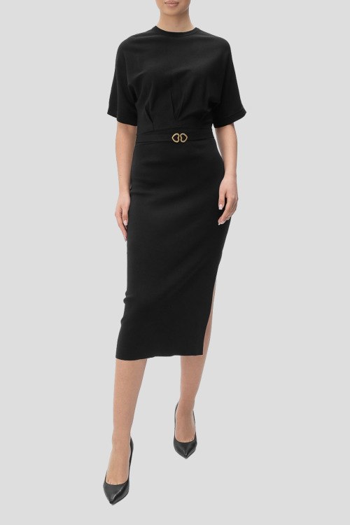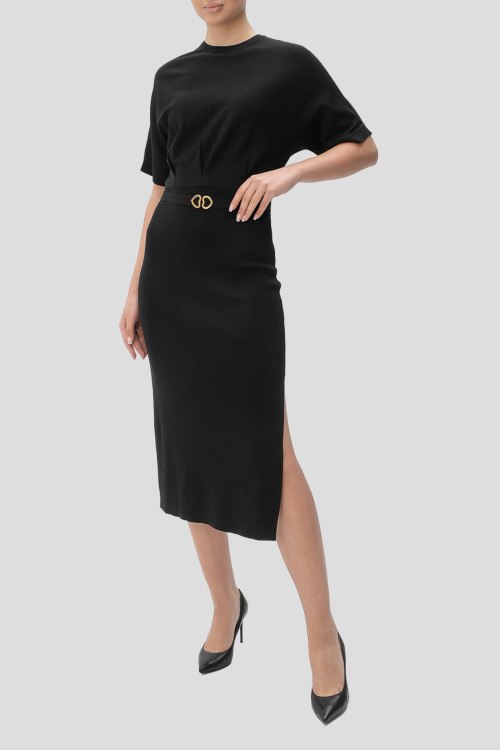 Детали: Женское черное трикотажное платье от TWINSET (Твинсет). Круглый вырез горловины, короткий рукав, в талии пояс с пряжкой в виде сердец, юбка-карандаш, разрез сбоку, длина-миди