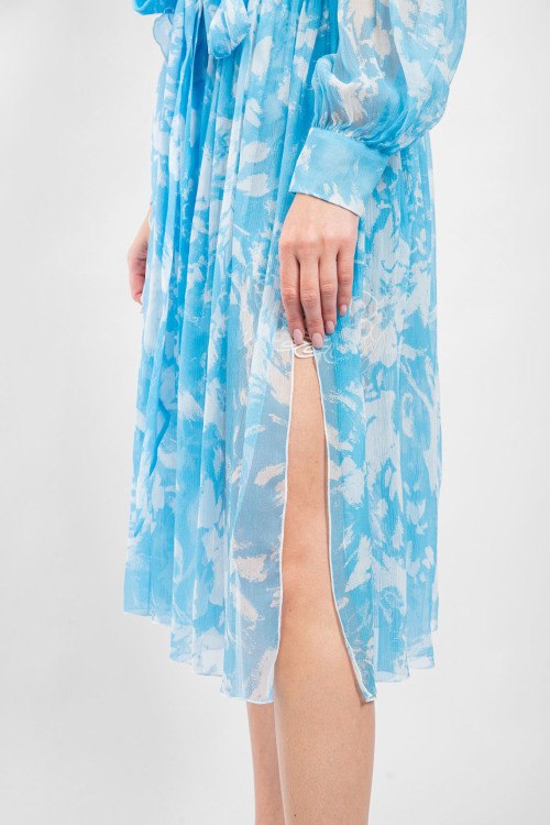 Детали: Женское голубое шелковое платье от Ermanno Scervino (Эрманно Шервино). Принт по всей поверхности, воротник-стойка, рюши на груди, длинный рукав, в талии с поясом, разрезы по бокам, длина-миди