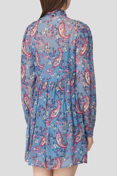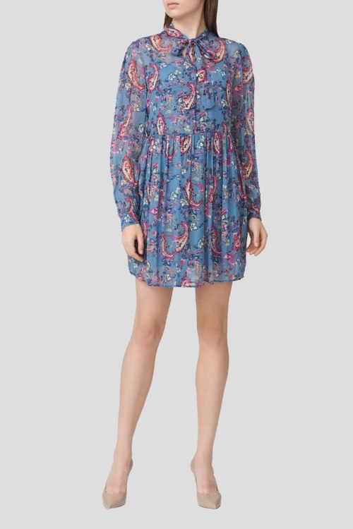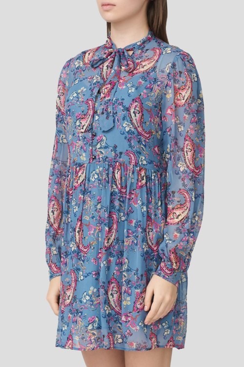 Детали: Женское голубое платье из вискозы от Liu Jo (Лиу Джо). Цветочный принт по всей поверхности, воротник-стойка на завязках, длинный рукав, короткая длина