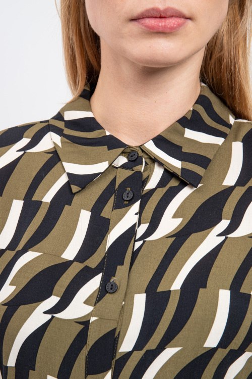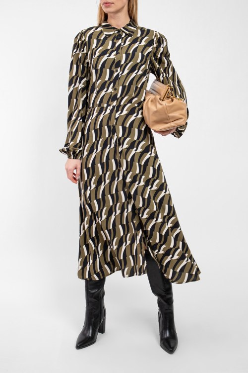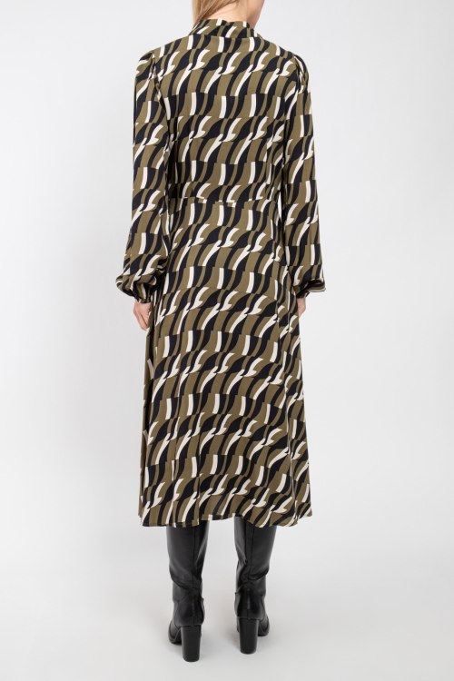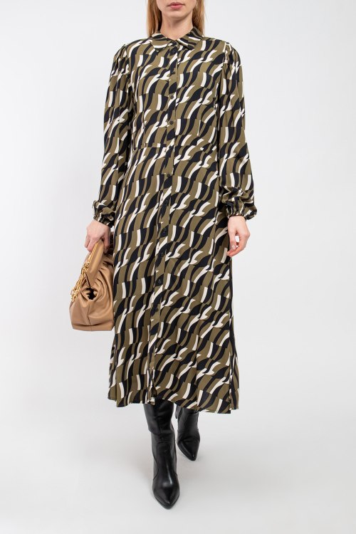 Женское платье цвета хаки из вискозы от Yerse (Йерс). Длина миди, дизайн в виде комбинации цветов, классический воротник, застежка на пуговицы, длинные рукава, приталенный силуэт, расклешенная юбка, прорезные карманы, ровный подол.