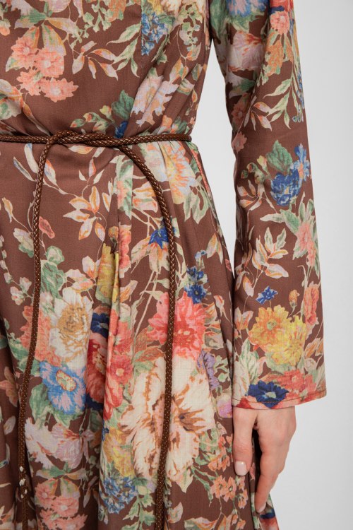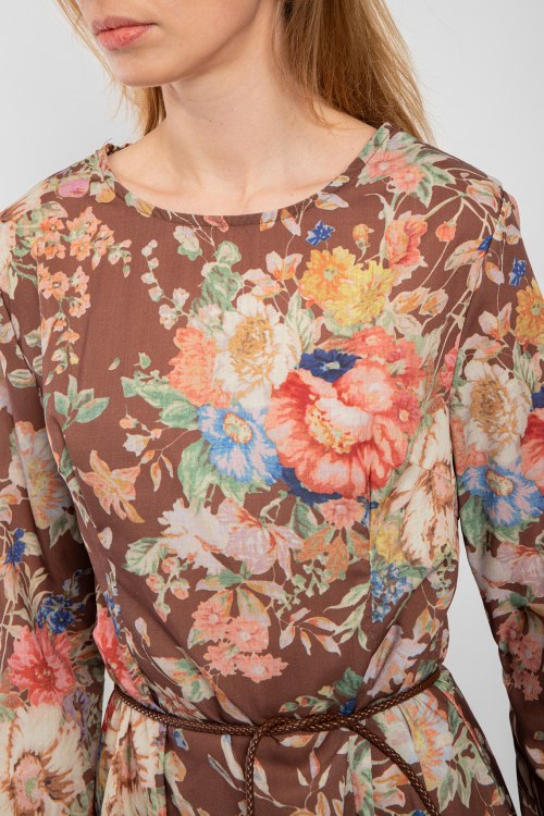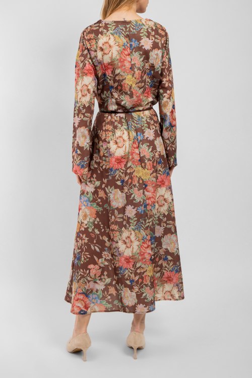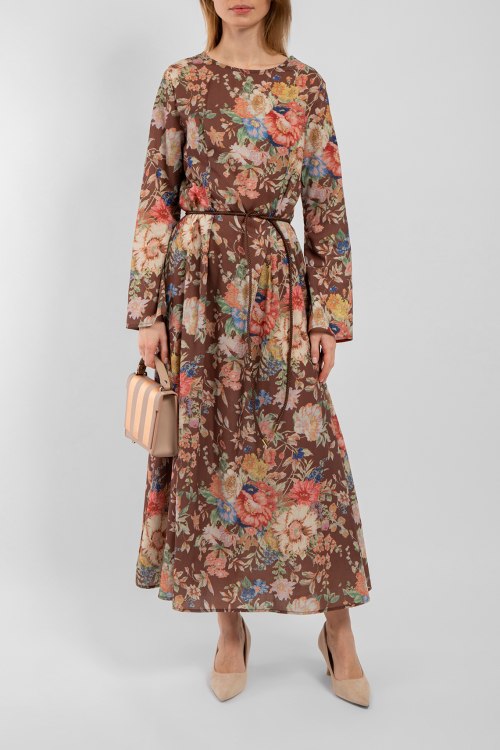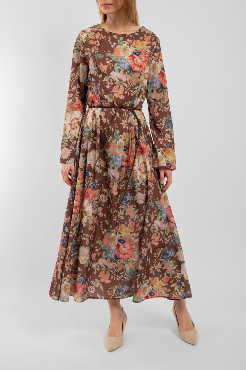 Женское коричневое платье из полиэстера и хлопка от Buby S (Баби Эс). Длина макси, круглый вырез горловины, длинные рукава, плетенный кожаный пояс в комплекте, застежка по плечам на молнии, ткань не тянется, цветочный принт по всей поверхности изделия. Замеры для размера L: длина: 131 см, ширина по груди: 49,5 см (есть вытачки), ширина по талии : 44 см, ширина по бедрам: 53,5 см, длина рукава 44,5 см, ширина рукава: 18,5 см.