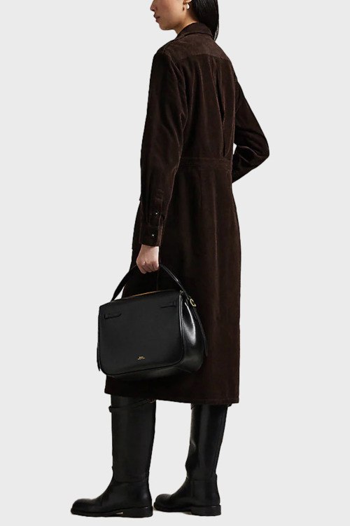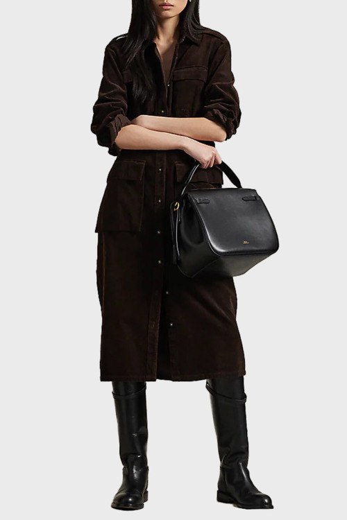 Детали: Женское платье шоколадного оттенка из хлопка от Polo Ralph Lauren (Поло Ральф Лорен). Длина миди, классический воротник, застежка на пуговицы, пояс в тон изделия, накладные карманы