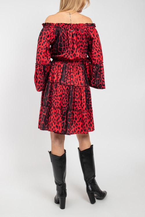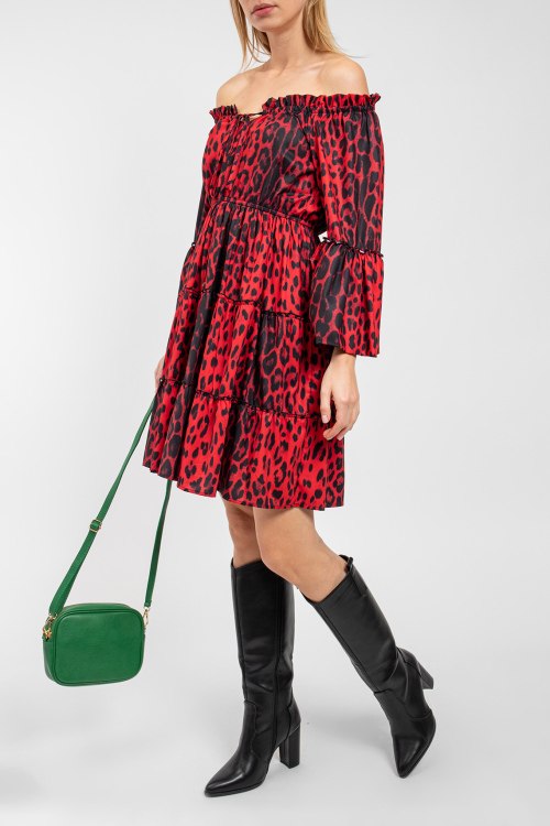 Женское красное платье из полиэстера от No Secrets (Ноу Сикретс). Красивая модель в длине до колен, открытые плечи, длинные расклешенные рукава, кулиска на поясе, прямой подол, дизайн с принтом "Лео" по всей поверхности изделия, минималистичный металлический логотип бренда, модель на подкладке.