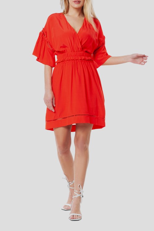 Женское красное платье из хлопка от Suncoo (Санку). Короткая длина, V-образный вырез горловины, короткие рукава свободного силуэта, эластичная резинка на поясе, расклешенная юбка, перфорированные детали. Соотношение размеров: T0 - XS/32, T1 - S/34, T2 - M/36, T3 - L/38, T4 - XL/40