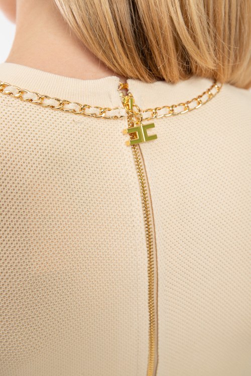 Женское кремовое трикотажное платье от Elisabetta Franchi (Елизабетта Франчи). Круглый вырез горловины, короткий рукав, золотистая фурнитура, застежка-молния на спине, облегающий фасон, длина-мини.