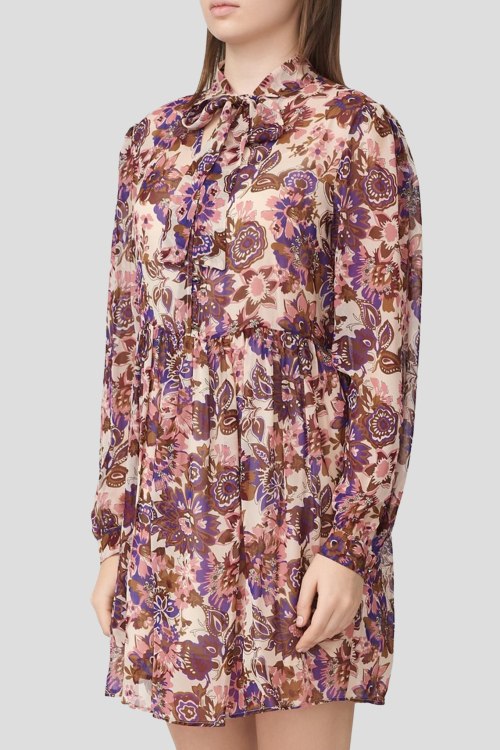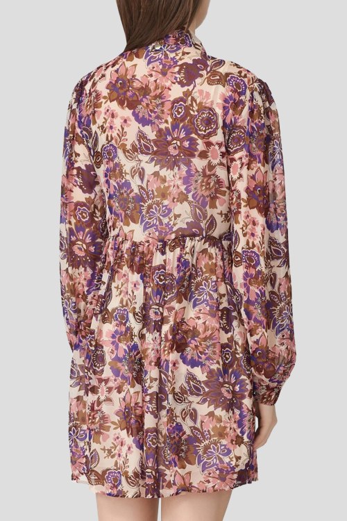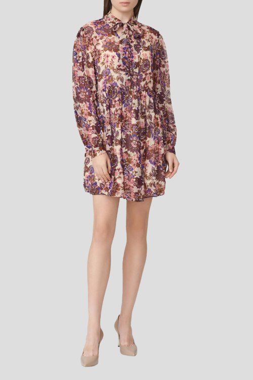 Детали: Женское кремовое платье из вискозы от Liu Jo (Лиу Джо). Цветочный принт по всей поверхности, воротник-стойка на завязках, длинный рукав, короткая длина