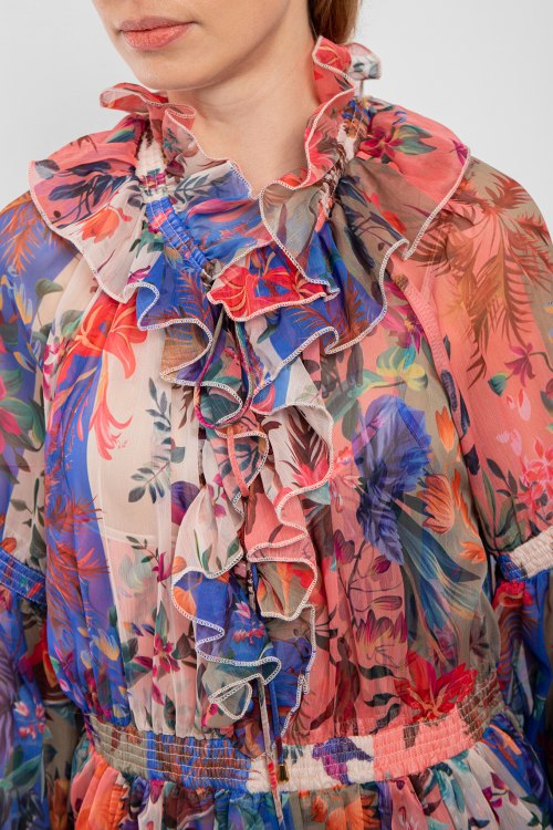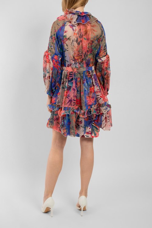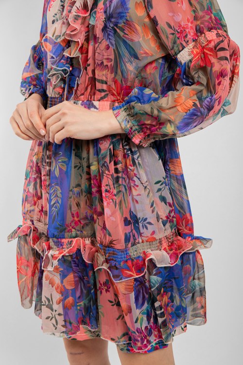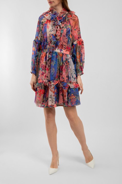 Женское платье из полиэстера от Buby S (Баби Эс).Короткая длина, комбинация цветов, цветочный принт по всей поверхности изделия, декорировано рюшами, длинные рукава, горловина с кулиской, эластичная резинка в поясе. Замеры для размера L: длина: 90 см, ширина по груди: 47 см, ширина по талии : 38 см, ширина по бедрам: 52 см, длина рукава по внутреннему шву: 38 см, ширина рукава: 19 см.