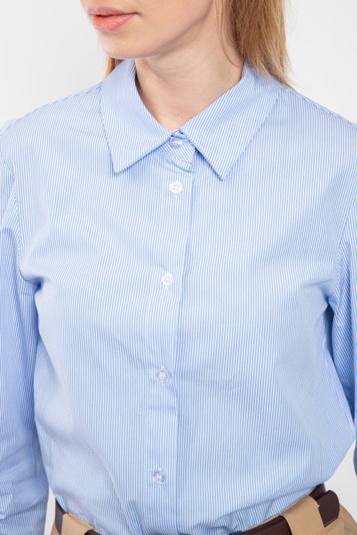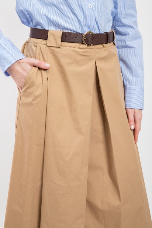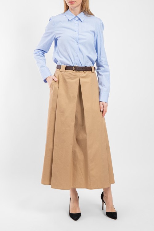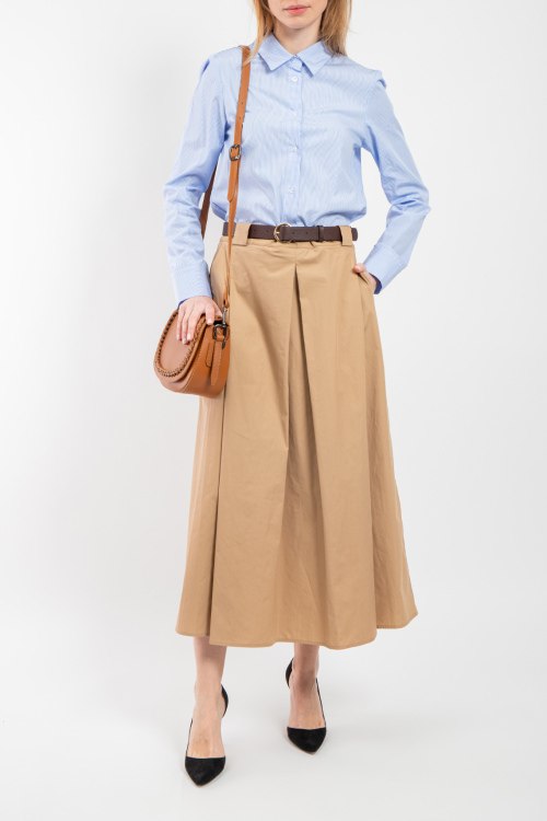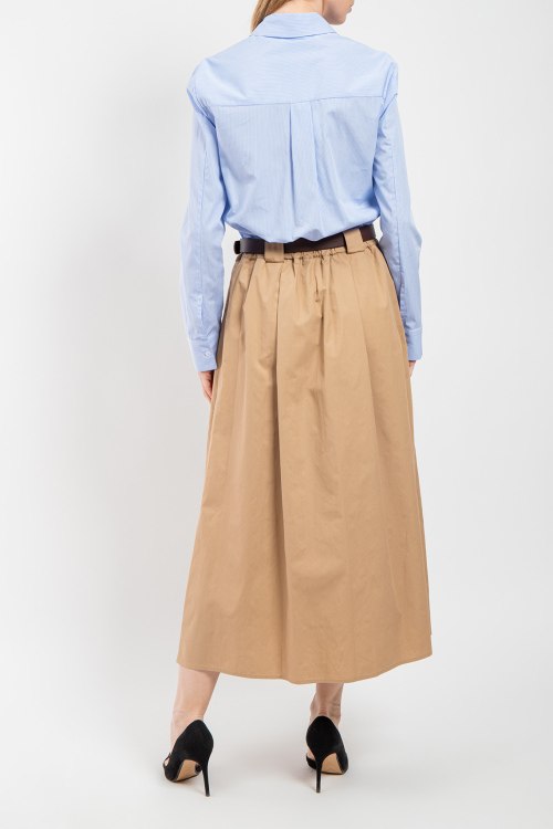 Женское платье из хлопка от Kocca (Кокка). Комбинированный дизайн, длина миди, голубая рубашка на пуговицах, длинные рукава, манжеты на пуговице, коричневая расклешенная юбка коричневого цвета, прорезные карманы, ровный подол.