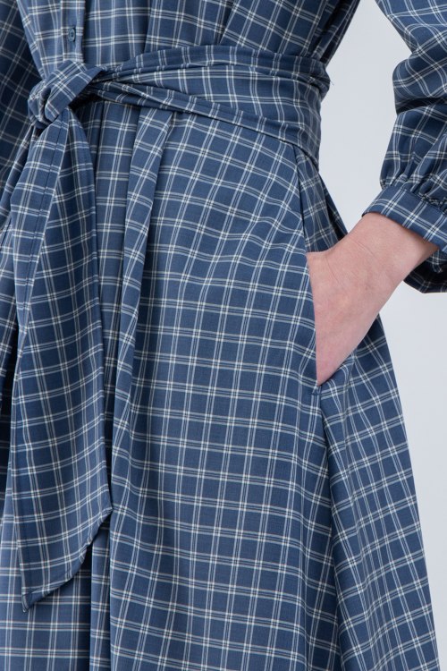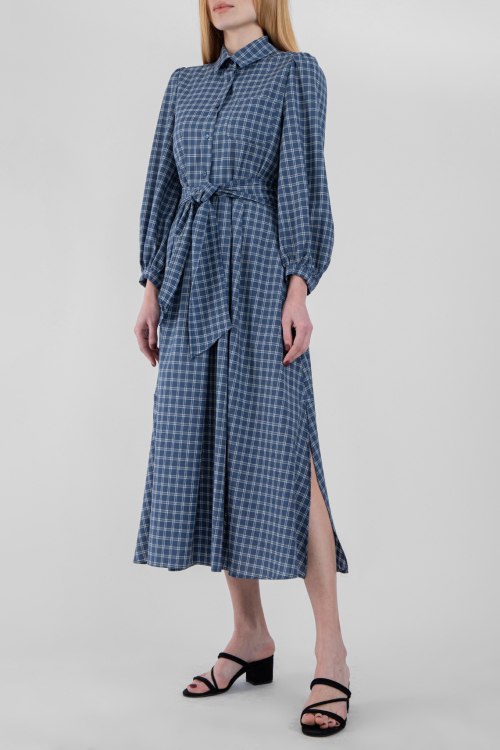 Женское синие платье в клетку из шерсти от Max Mara (Макс Мара).Длина миди, приталенный силуэт, отложной воротник, застежка на пуговицы, пояс в тон изделия, прорезные боковые карманы, ровный подол, длинные рукава.