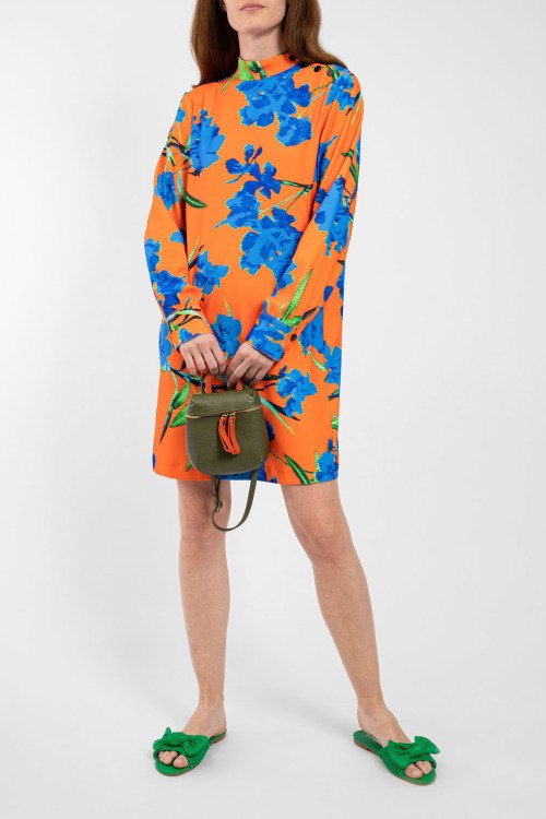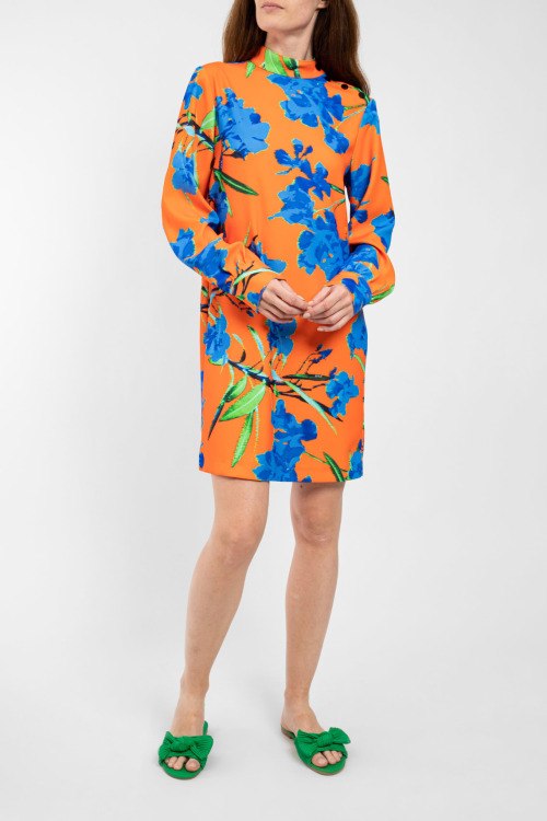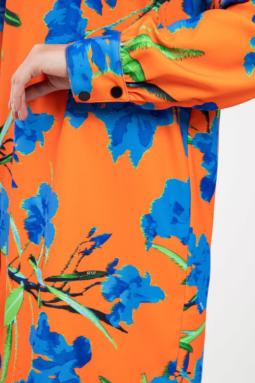Детали: Женское оранжевое платье из полиэстера от Ice Play (Айс Плей). Короткая длина, воротник-стойка, застежка на пуговицы, свободный силуэт, цветочный принт по всей поверхности изделия, длинные рукава, манжеты на пуговицах, ровный подол