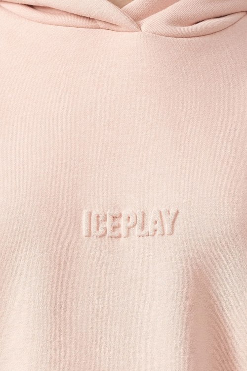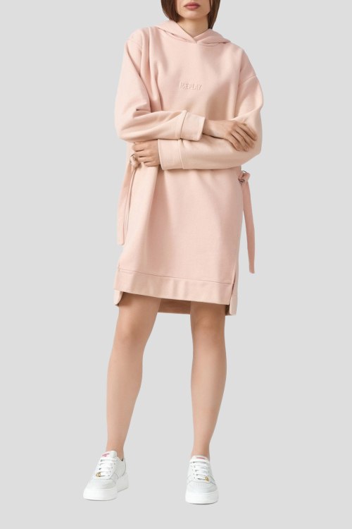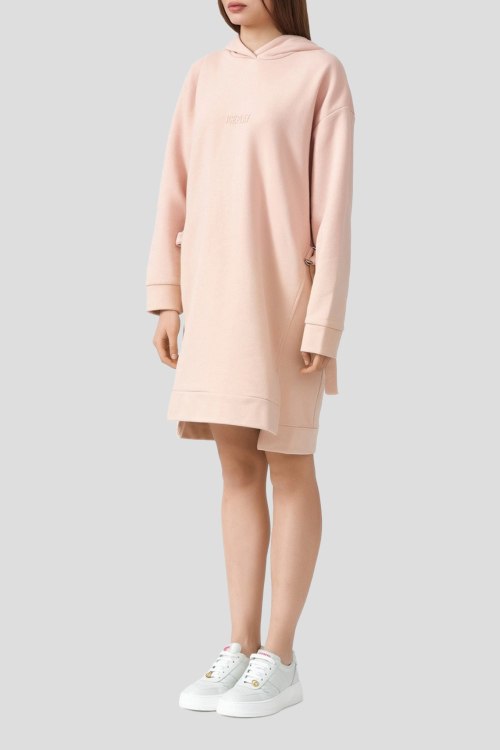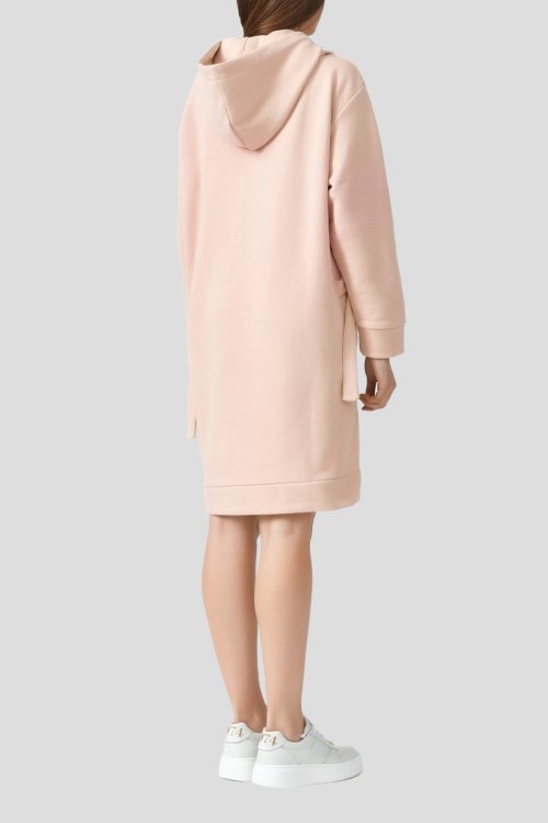 Детали: Женское персиковое платье из хлопка от Ice Play (Айс Плей). Длина до колена, длинные рукава, вшитый капюшон, логотип бренда, свободный крой