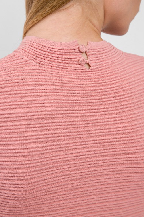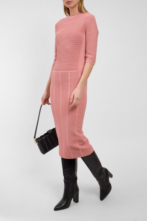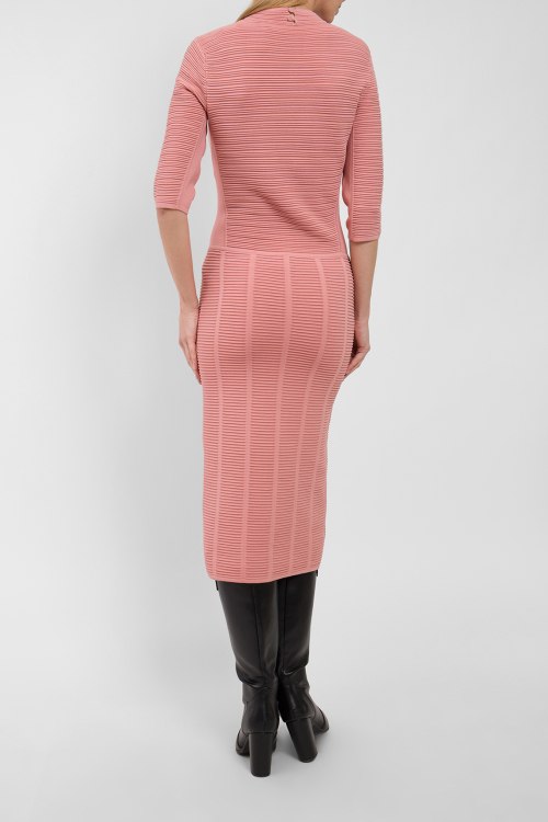 Женское светло-розовое платье из вискозы от Armani (Армани). Дизайн в рубчик, круглый вырез горловины, укороченный рукав, застежка на пуговицы сзади на воротнике, длина-миди.