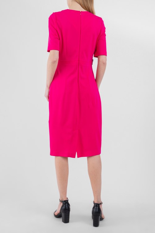 Женское розовое платье из микса вискозы от Nissa (Нисса). Длина миди, V-образный вырез горловины, короткие рукава, сзади застежка молния, внизу разрез, верх на запах, контрастная линия талии с ажурным узором.