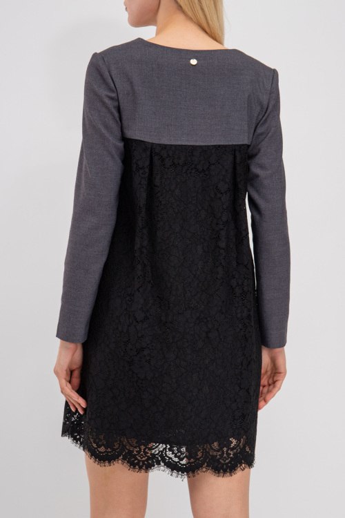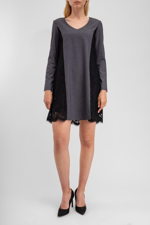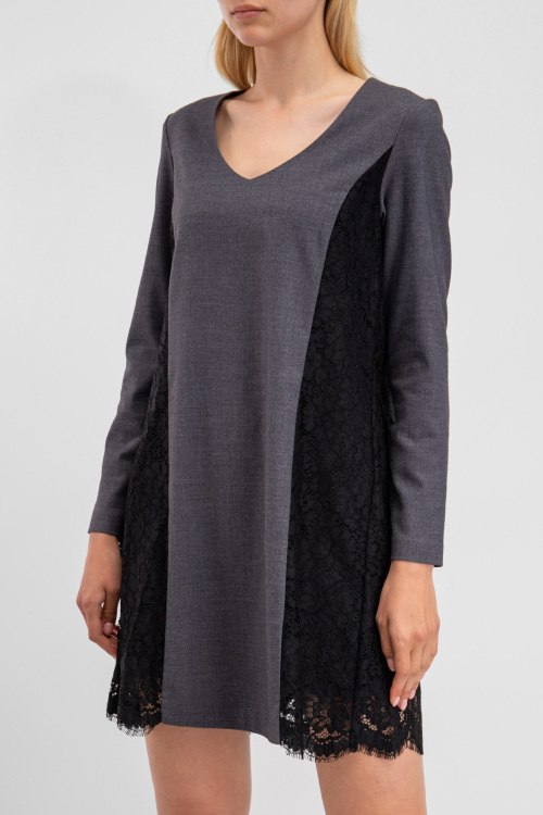 Женское темно-серое платье из вискозного микса от TWINSET (Твинсет). Короткая длина, комбинированный дизайн, кружевные вставки по бокам изделия. Замеры товара для размера S: длина - 86 см, плечи - 39 см, п/о груди - 45 см, п/о талии - 47 см, п/о бедер - 55 см, длина рукава - 46 см, ширина рукава вверху - 16 см. Ткань не тянется, рукав втачной, низ ровный, талия без резинки.