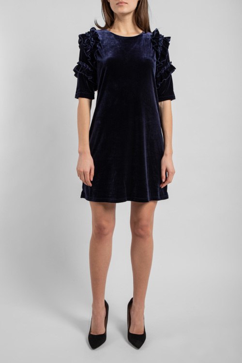 Детали: Женское темно-синее платье от Imperial (Империал). Свободный силуэт, декор рюшами, круглый вырез горловины, короткий рукав, короткая длина