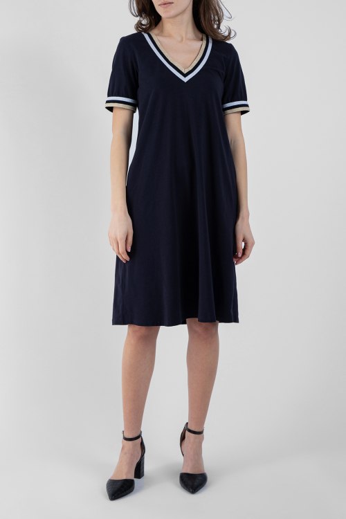 женское темно-синее платье из вискозного микса от Luna Di Giorno (Луна Ди Жиорно). длина до колена. короткие рукава, V-образный вырез горловины с контрастной окантовкой, прорезные карманы, ровный низ изделия.