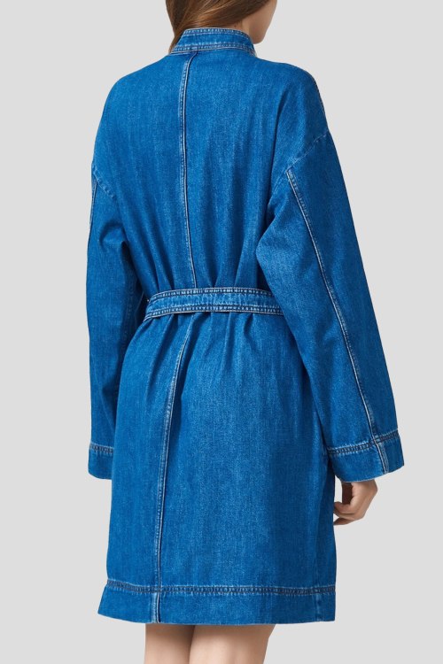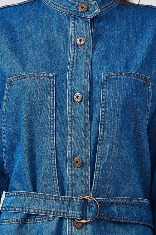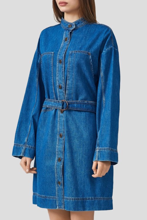 Детали: Женское синее платье из хлопка от Max Mara (Макс Мара). Короткая длина, воротник-стойка, застежка на пуговицы, длинные рукава, модель дополнена поясом в тон изделия