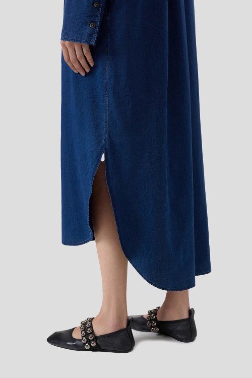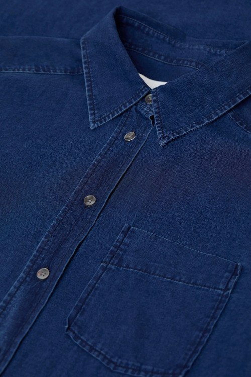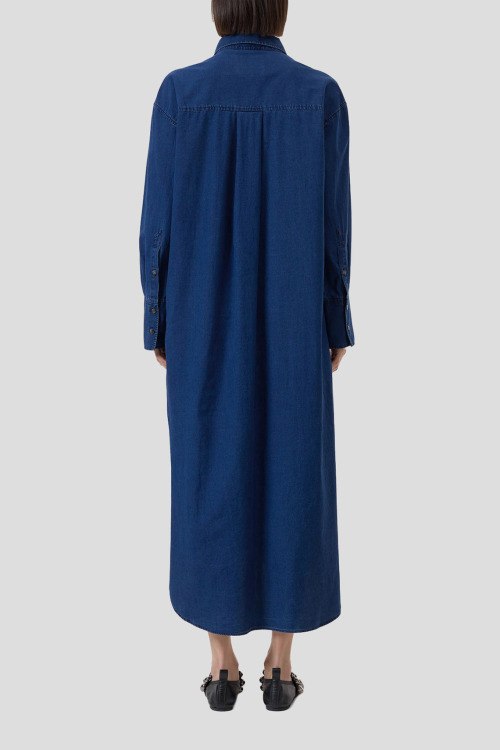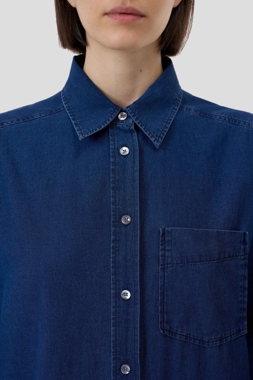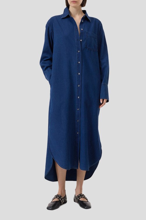 Детали: Женское темно-синее платье из хлопка от Closed (Клоузед). Прямой фасон, асимметричный фигурный низ, длинные рукава, отложной воротник, застежка на пуговицы, длина - миди, накладной карман на груди