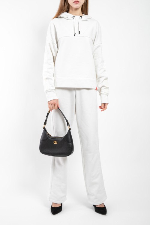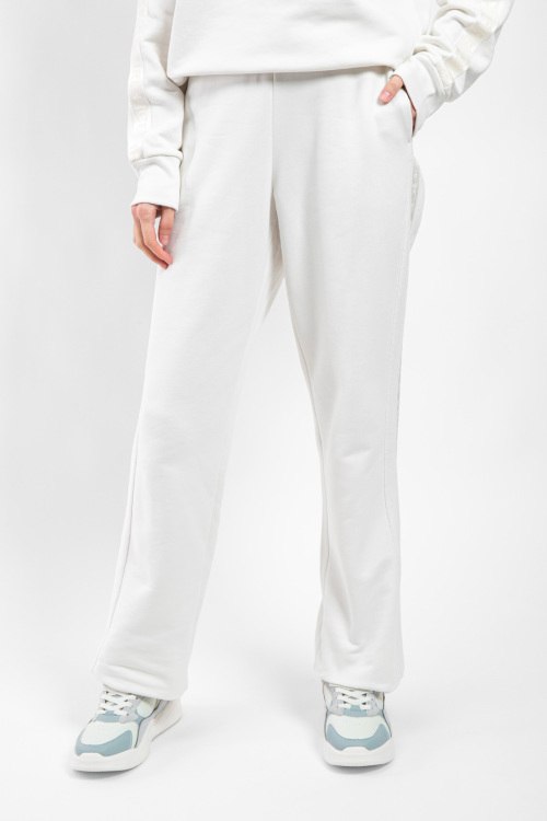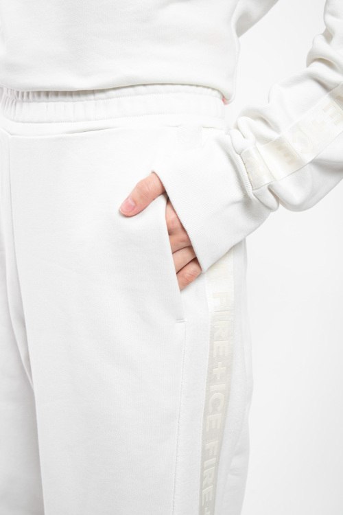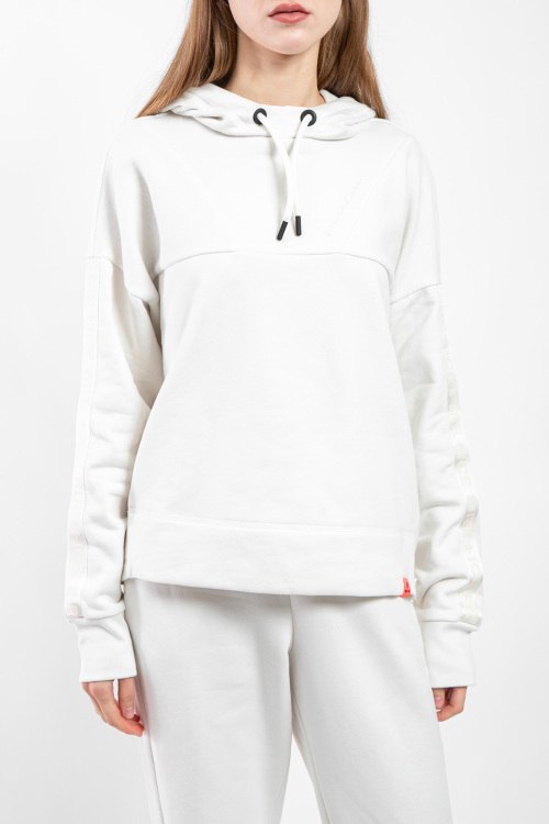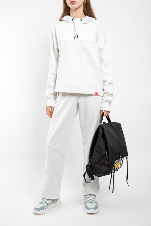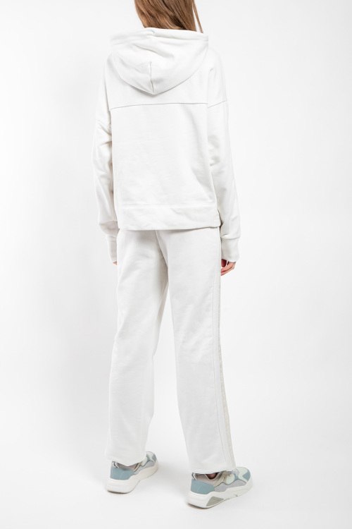 Детали: Женский белый хлопковый прогулочный костюм от Bogner (Богнер). Худи: капюшон на завязках, нашивка с логотипом, классическая длина, трикотажные манжеты и нижний край. Брюки: эластичный пояс, брендированные лампасы, боковые карманы, низ без манжетов, полная длина