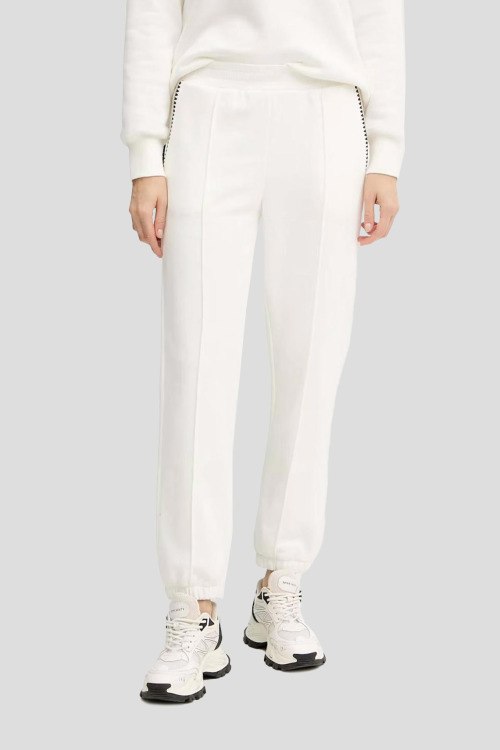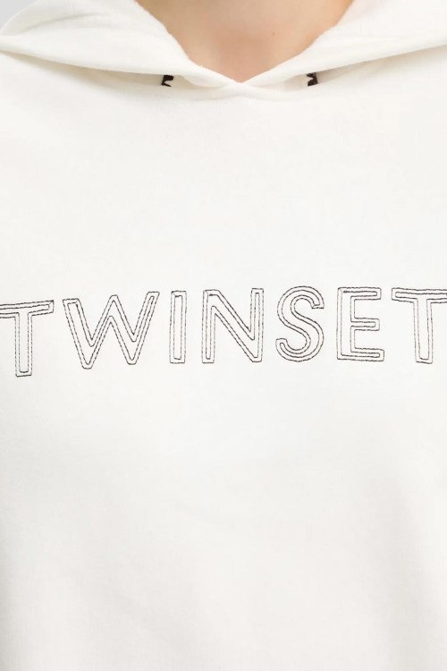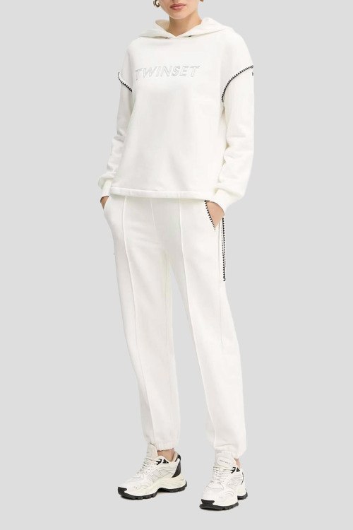Детали: Женский белый хлопковый прогулочный костюм от TWINSET (Твинсет). Худи: вшитый капюшон, логотип на груди, контрастная вышивка на рукавах, по бокам на завязках, классическая длина. Брюки: эластичный пояс, боковые карманы, манжеты на резинке, полная длина