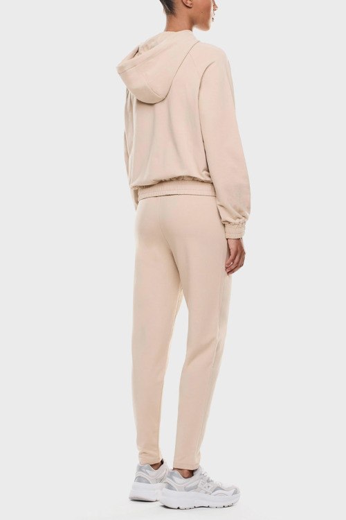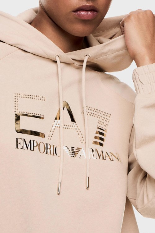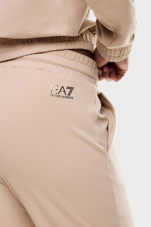 Детали: Женский бежевый хлопковый прогулочный костюм от EA7 Emporio Armani (ЕА7 Эмпорио Армани). Худи: капюшон на завязках, логотип на груди, классическая длина, манжеты и нижний край на резинке. Брюки: эластичный пояс, боковые карманы, низ без манжетов, полная длина