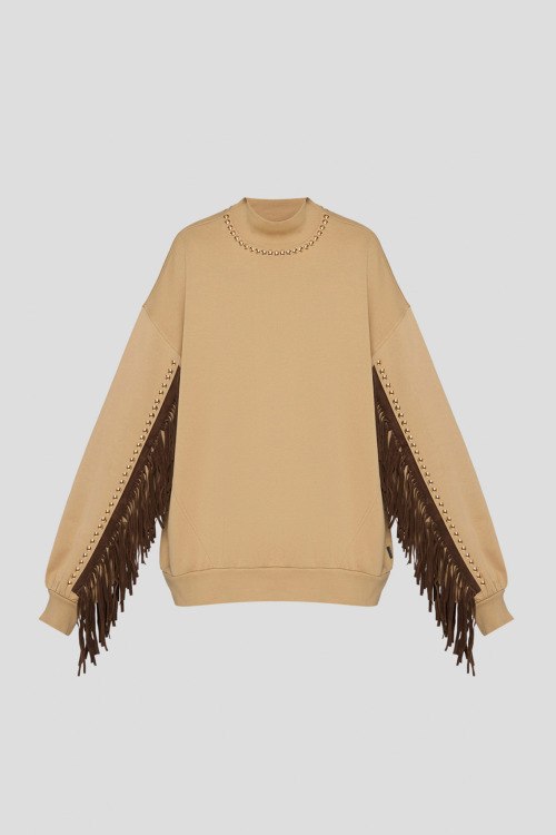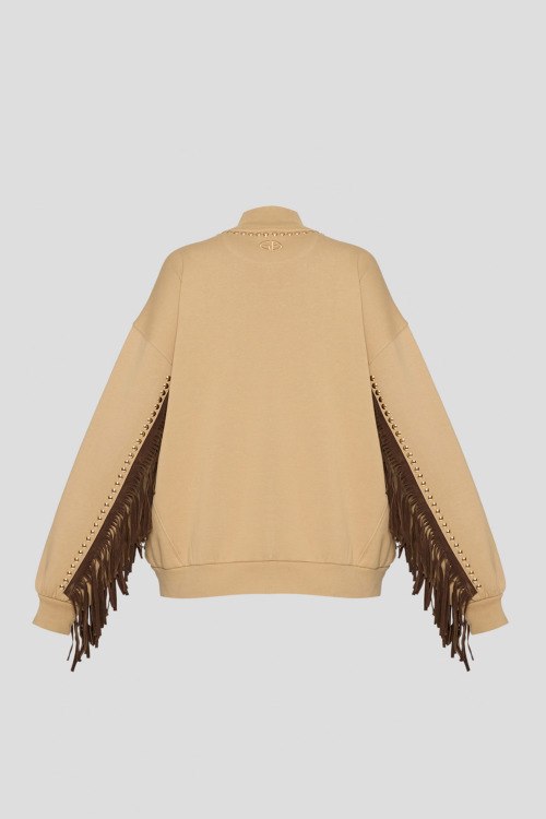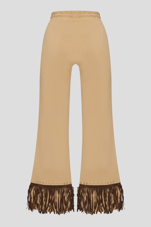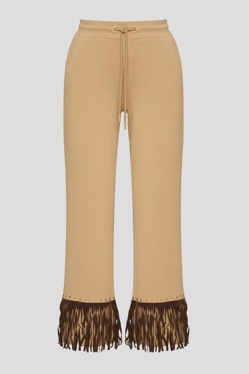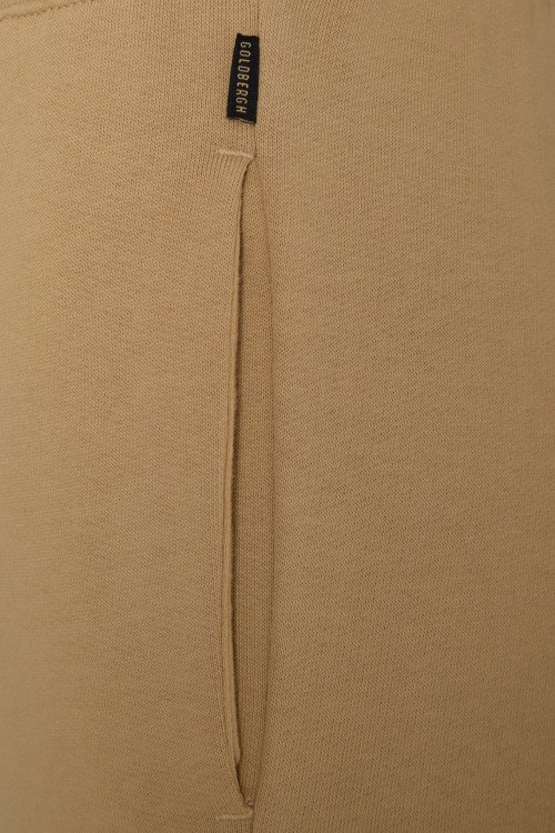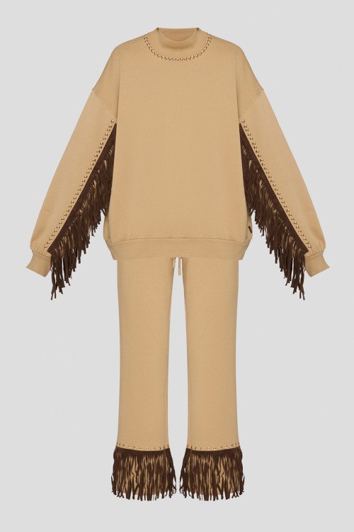 Детали: Женский бежевый хлопковый прогулочный костюм от Goldbergh (Голдберг). Свитшот: декор заклепками и бахромой, круглый вырез горловины, спущенная линия плеча, трикотажные манжеты и нижний край. Длина рукава: длинный, для размера S - 54 см, обхват груди: для размера S - 132 см, обхват талии: для размера S - 126 см, длина изделия по среднему шву спинки от горловины: для размера S - 63 см. Брюки: эластичный пояс на завязках, боковые карманы, декор заклепками и бахромой. Обхват пояса: для размера S - 78 см, обхват бедер: для размера S - 102 см, длина штанины: для размера S - 100 см, длина по шаговому шву: для размера S - 75 см