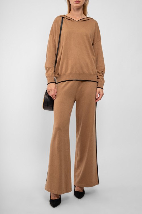 Женский костюм из вискозы и шерсти цвета кэмел от Kocca (Кокка). Худи: вшитый капюшон, спущенная линия плеча, манжеты и нижний край в рубчик, классическая длина. Брюки: трикотажный пояс, черные лампасы, расклешенный крой, классическая длина.