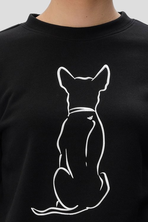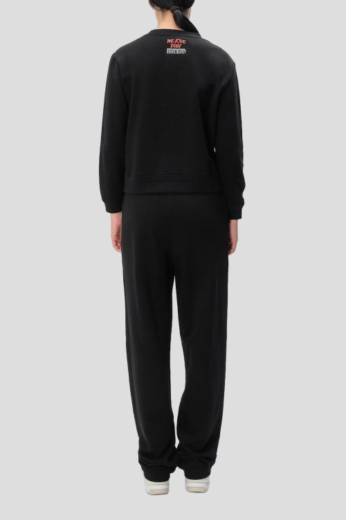 Детали: Женский черный хлопковый прогулочный костюм от Emporio Armani (Эмпорио Армани). Свитшот: принт на груди, круглый вырез горловины, классическая длина, трикотажные манжеты и нижний край. Брюки: эластичный пояс на завязках, боковые карманы, низ без манжетов, полная длина