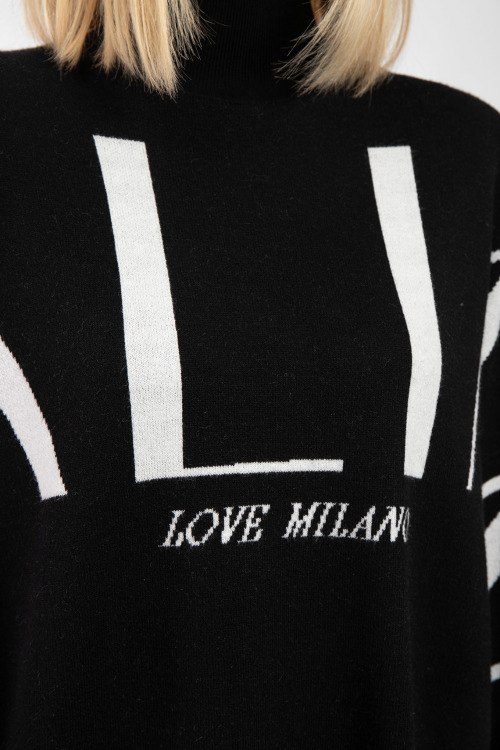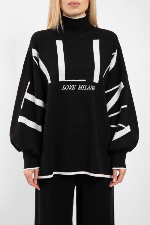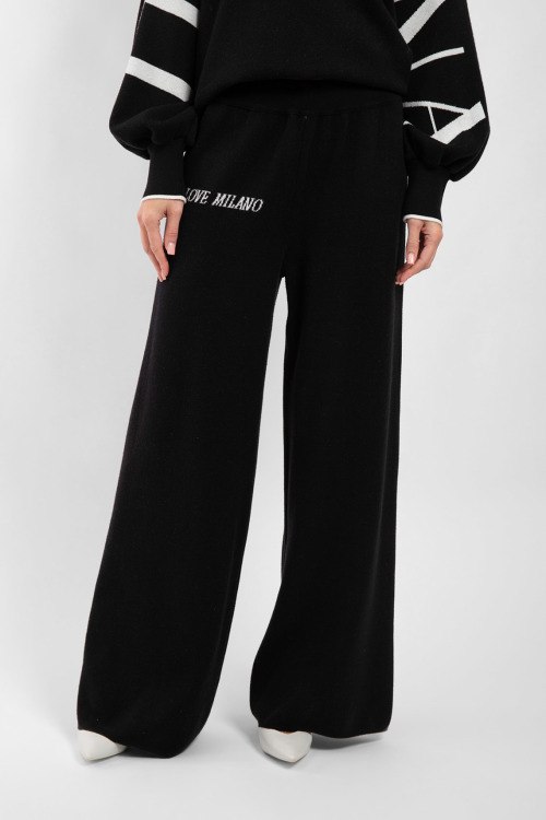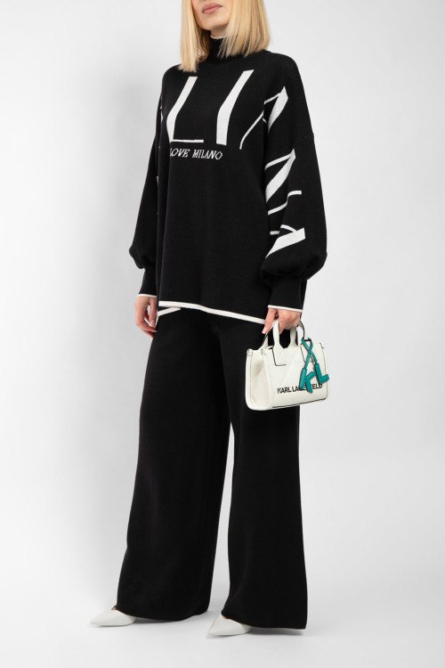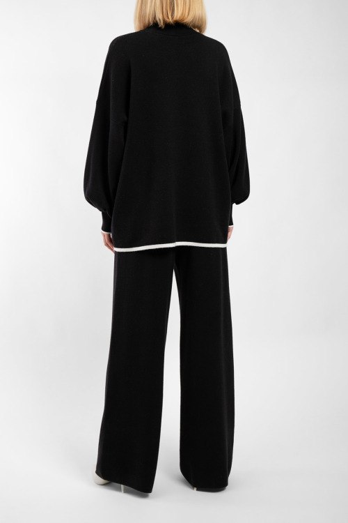 Женский черный костюм из вискозы, полиамида и полиэстера от Barbara Alvisi (Барбара Алвиси). Джемпер с принтом, воротник-стойка, спущенная линия плеча, трикотажная резинка на манжетах, брюки классической длины, эластичная резинка на поясе, расклешенная модель от бедра. Измерения: длина кофты: 71 см, ширина по груди: 66 см, ширина по линии талии: 66 см, длина рукава по внутреннему шву: 49 см, ширина рукава: 28 см, длина брюк: 113 см, ширина по талии: 47 см, ширина по бедрам: 52 см, высота сидения 35 см, ширина штанины вверху: 31 см.