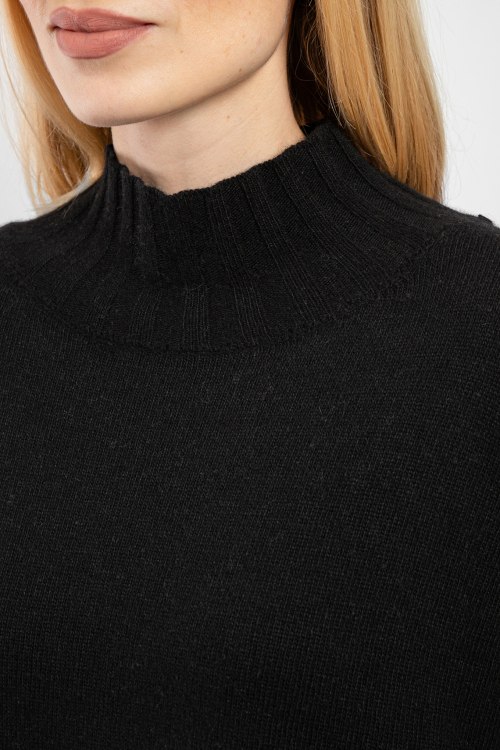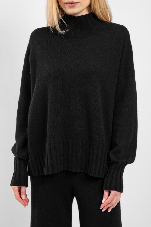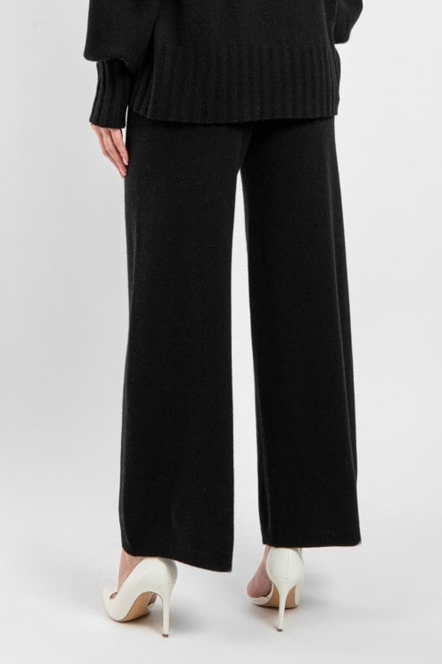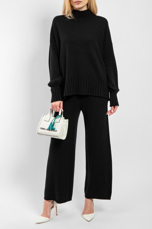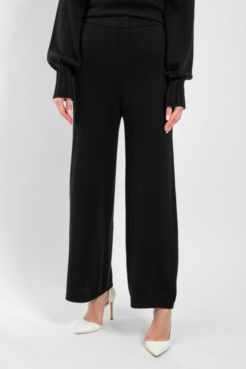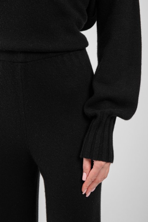 Женский черный костюм из шерсти и кашемира от Clothe (Клозе). Джемпер: высокая горловина, спущенная линия плеча, классическая длина. Брюки: эластичный пояс, широкий крой, полная длина.