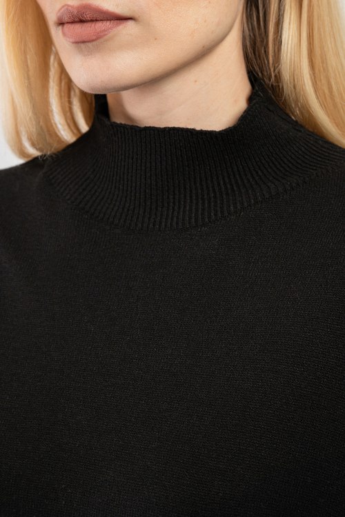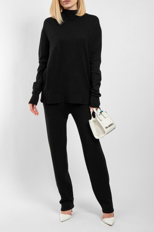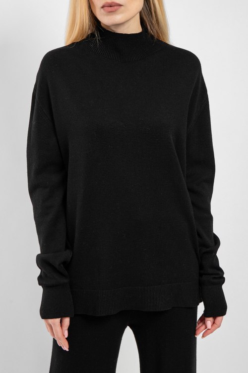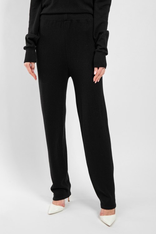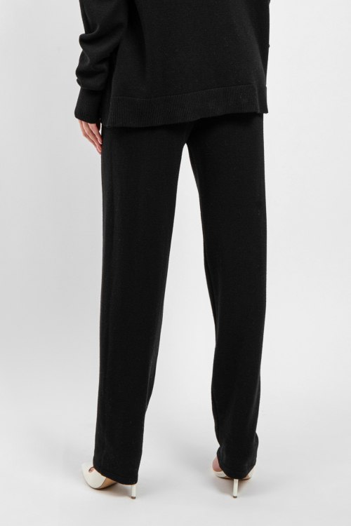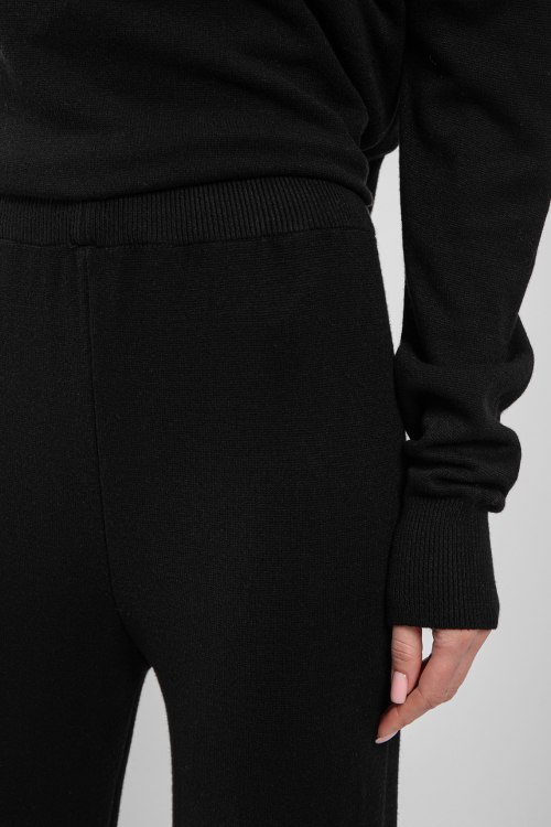 Женский черный трикотажный костюм от Clothe (Клозе). Джемпер: высокая горловина, спущенная линия плеча, классическая длина, манжеты и нижний край в рубчик. Брюки: эластичный пояс, прямой крой, полная длина.