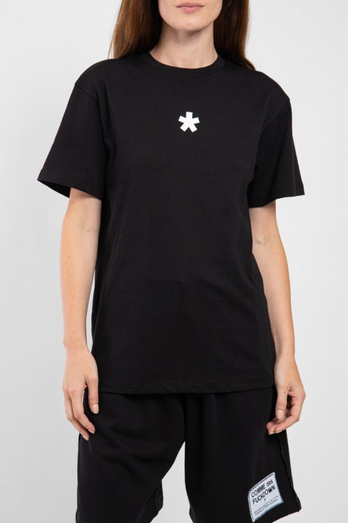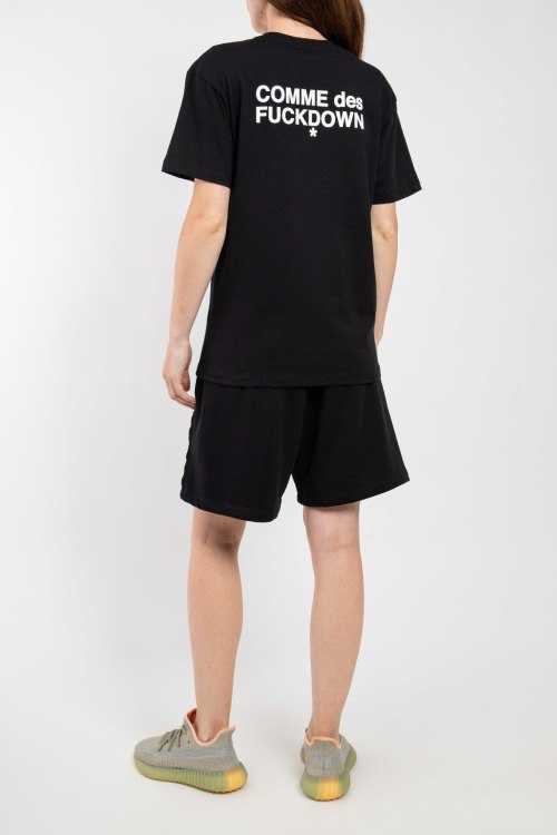 Женский черный хлопковый прогулочный костюм от Comme des Fuckdown (Камм дес Факдаун). Футболка: принт на груди, круглый вырез горловины, короткий рукав, удлиненная длина. Шорты: эластичный пояс на завязках, боковые карманы, нашивка с логотипом, длина до колен.