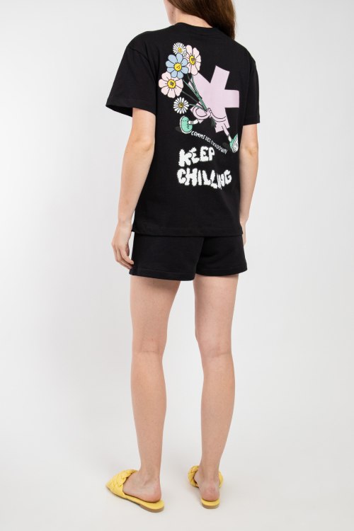 Женский черный хлопковый прогулочный костюм от Comme des Fuckdown (Камм дес Факдаун). Футболка: принт спереди и сзади, круглый вырез горловины, короткий рукав, удлиненная длина. Шорты: эластичный пояс, боковые карманы, принт с логотипом, короткая длина.