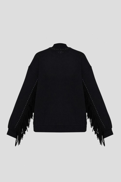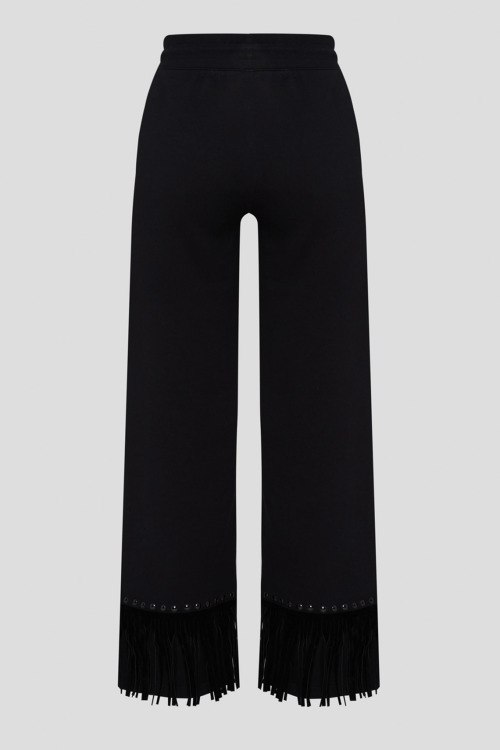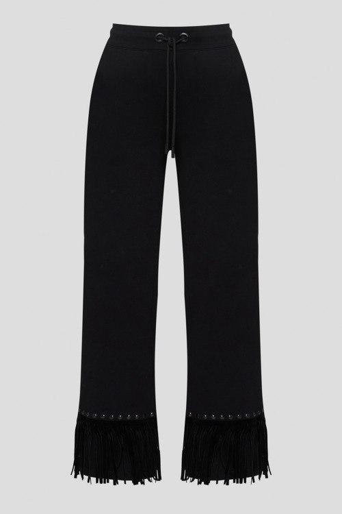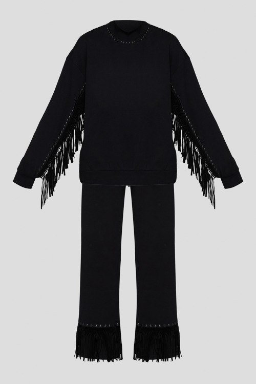 Детали: Женский черный хлопковый прогулочный костюм от Goldbergh (Голдберг). Свитшот: декор заклепками и бахромой, круглый вырез горловины, спущенная линия плеча, трикотажные манжеты и нижний край. Длина рукава: длинный, для размера S - 54 см, обхват груди: для размера S - 132 см, обхват талии: для размера S - 126 см, длина изделия по среднему шву спинки от горловины: для размера S - 63 см. Брюки: эластичный пояс на завязках, боковые карманы, декор заклепками и бахромой. Обхват пояса: для размера S - 78 см, обхват бедер: для размера S - 102 см, длина штанины: для размера S - 100 см, длина по шаговому шву: для размера S - 75 см