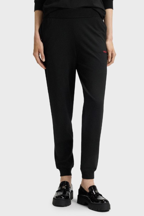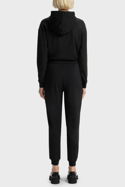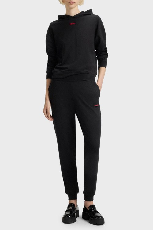 Детали: Женский черный прогулочный костюм из хлопка и модала Shuffle от Hugo by Hugo Boss (Хуго бай Хуго Босс). Худи: вшитый капюшон, логотип на груди, классическая длина, трикотажные манжеты и нижний край. Брюки: эластичный пояс, логотип, боковые карманы, трикотажные манжеты, полная длина
