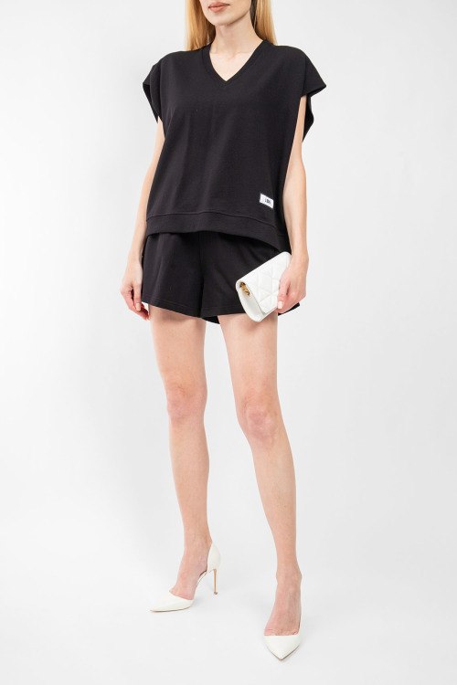 Женский черный хлопковый прогулочный костюм от J.B4 Just Before (Джаст Бифо). Футболка: V-образный вырез, короткий рукав, нашивка с логотипом, классическая длина. Шорты: эластичный пояс с логотипом, боковые карманы, короткая длина.