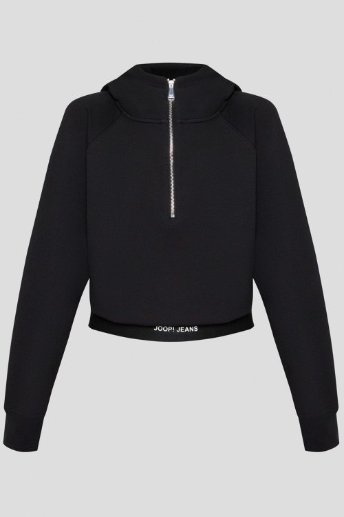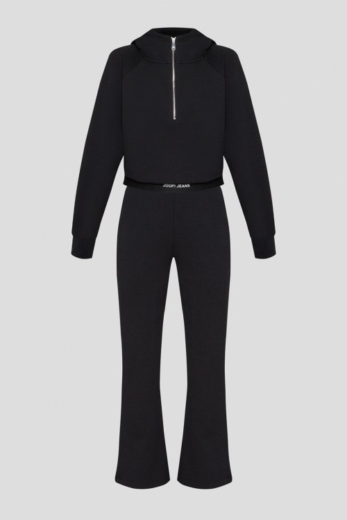 Детали: Женский черный хлопковый прогулочный костюм от Joop! (Йооп!). Худи: капюшон, застежка-молния, нижний край с логотипом, трикотажные манжеты. Длина рукава: длинный, для размера S - 68 см, обхват груди: для размера S - 110 см, обхват талии: для размера S - 78 см, длина изделия по среднему шву спинки от горловины: для размера S - 50 см. Брюки: эластичный пояс с логотипом, расклешенный крой, полная длина. Обхват пояса: для размера S - 70 см, обхват бедер: для размера S - 96 см, длина штанины: для размера S - 106 см, длина по шаговому шву: для размера S - 78 см