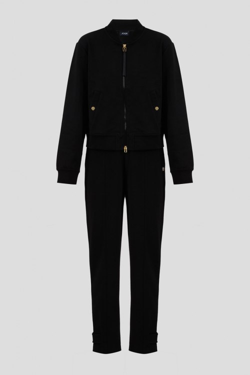 Детали: Женский черный прогулочный костюм из хлопка от Joop! (Йооп!). Кофта с застежкой-молнией, воротник-стойка, эластичные манжеты на рукавах, два кармана на кнопках. Брюки полной длины, эластичная резинка на поясе, боковые карманы, декорированы ремешками. Золотистая фурнитура с гравировкой логотипа. Замеры: длина рукава: длинный, для размера 36 - 60,5 см, обхват груди: для размера 36 - 102 см, обхват талии: для размера 36 - 94 см, длина изделия по среднему шву спинки от горловины: для размера 36 - 51,5 см. Брюки: обхват пояса: для размера 36 - 70 см, обхват бедер: для размера 36 - 100 см, длина штанины: для размера 36 - 97 см, длина по шаговому шву: для размера 36 - 69 см