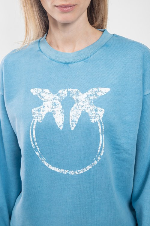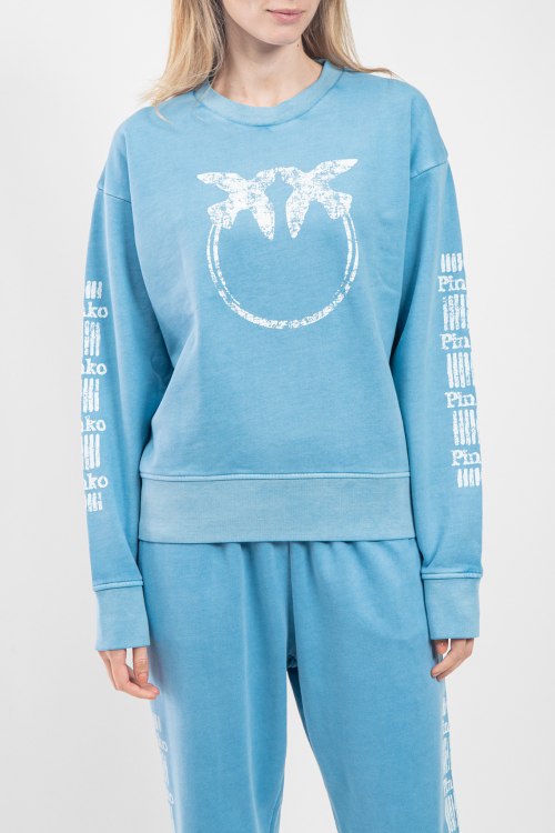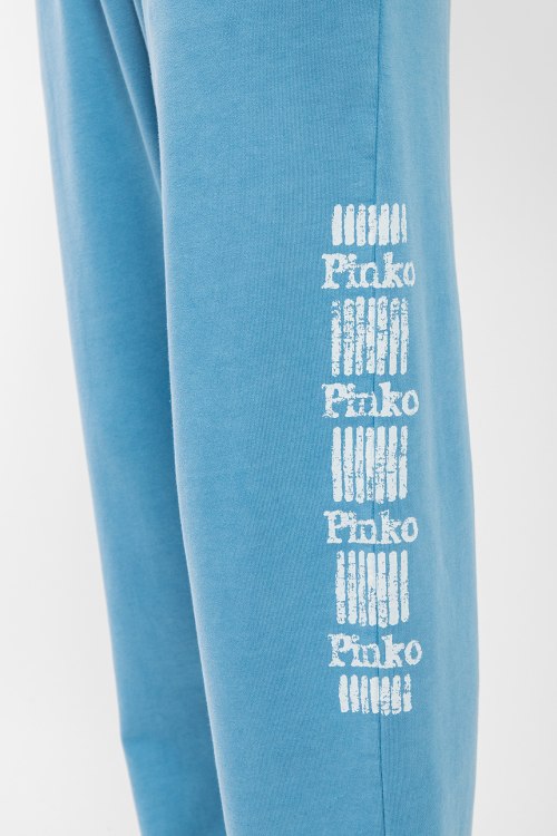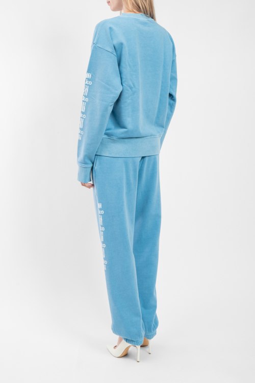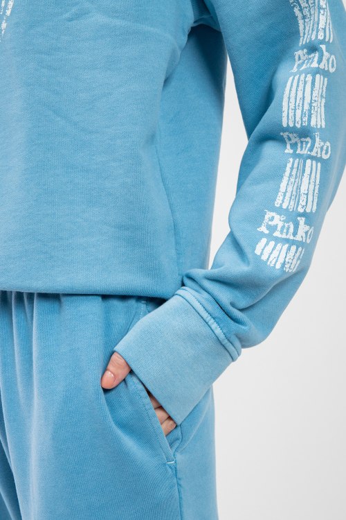Женский голубой хлопковый костюм от Pinko (Пинко). Свитшот: логотип на груди и на рукавах, круглый вырез горловины, классическая длина, трикотажные манжеты и нижний край. Брюки: эластичный пояс, боковые карманы, принт с логотипом, манжеты на резинке, полная длина.