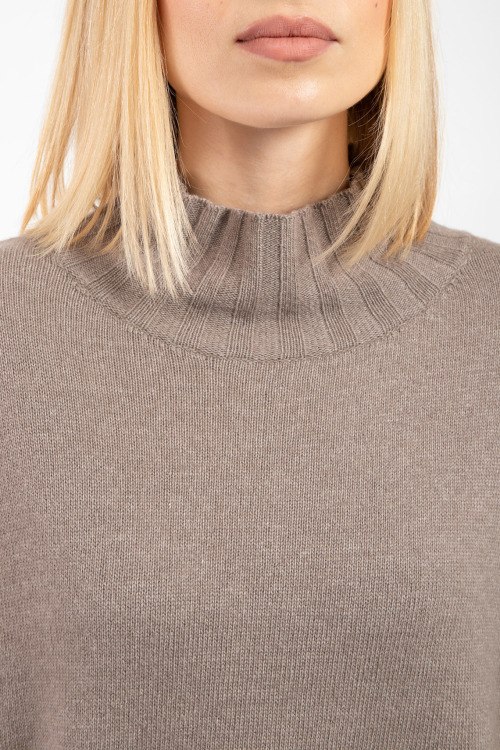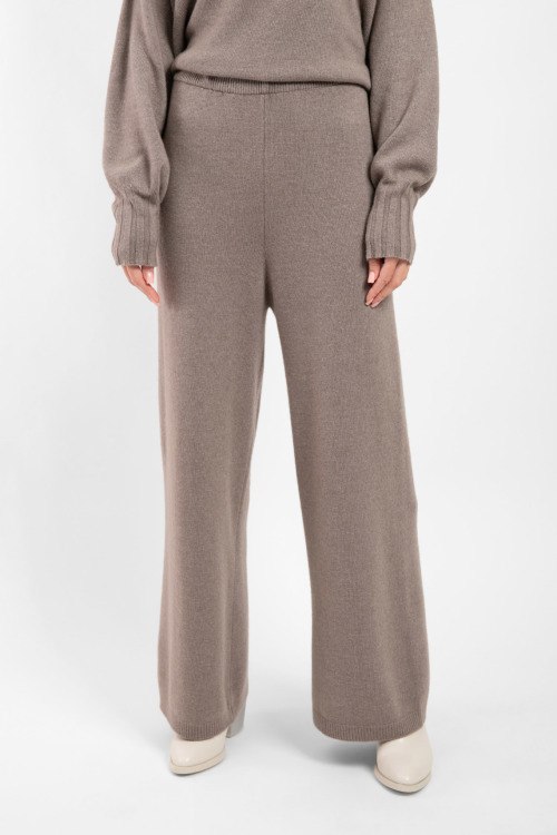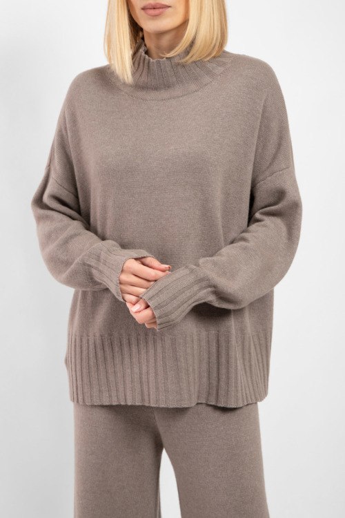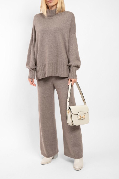 Женский коричневый костюм из шерсти и кашемира от Clothe (Клозе). Джемпер свободного силуэта, воротник-стойка, длинные рукава, приспущенная линия плеча, трикотажная резинка на манжетах и по низу изделия, брюки классической длиной, высокая посадка, эластичная резинка на поясе, расклешенная модель от бедра. Измерения: длина кофты: 71 см, ширина по груди: 68 см, ширина по талии: 66 см, длина рукава по внутреннему шву: 50 см, ширина рукава: 20 см, длина брюк: 116 см, ширина по талии: 42 см, ширина по бедрам: 47 см, высота сидения 41 см, ширина штанины вверху: 32 см.